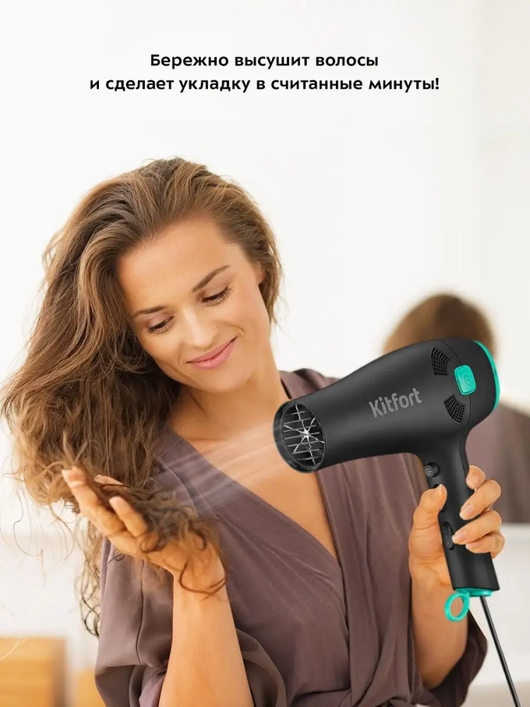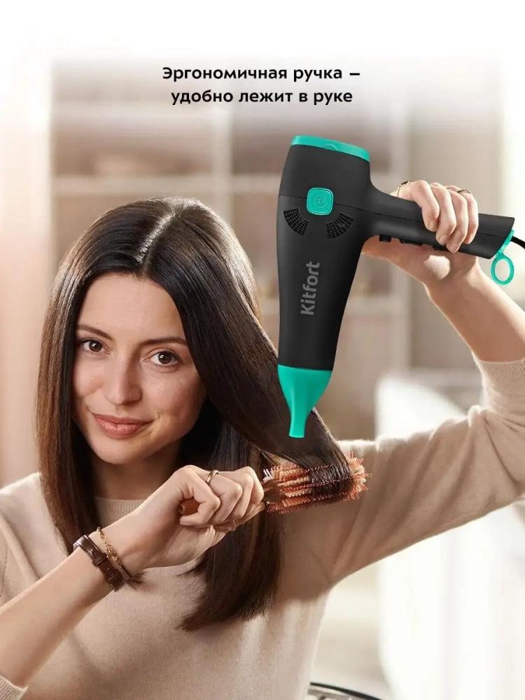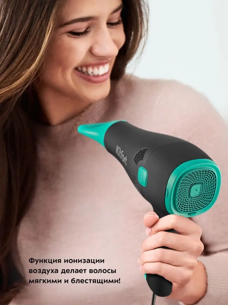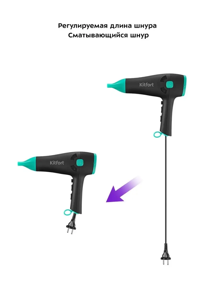 С помощью фена КТ-3222 вы сможете быстро высушить волосы и сделать красивую укладку. Фен выдает направленный поток воздуха, поэтому волосы с ним сушить просто и удобно. Фен позволяет регулировать температуру и скорость потока воздуха. Вы можете установить холодный, теплый или горячий воздух, а также выбрать нужную скорость потока воздуха.Данная модель оснащена функцией ионизации воздуха. Ионизация приглаживает кутикулу волос, делая их более блестящими и мягкими, помогает сохранять влагу внутри волоса, облегчает расчесывание волос. Благодаря ионизации волосы перестают электризоваться.Вы можете самостоятельно регулировать длину шнура при использовании фена. Отличительной особенностью данной модели является сматывающийся шнур. После использования шнур полностью убирается в корпус прибора, так что фен занимает меньше места при хранении. Устройство оснащено специальной петлей для хранения в вертикальном положении.Корпус фена выполнен из пластика, эргономичная ручка фена удобно лежит в руке. Насадка-концентратор направляет поток воздуха именно на прядь волос, позволяя ей высохнуть намного быстрее, это значительно ускоряет время укладки.