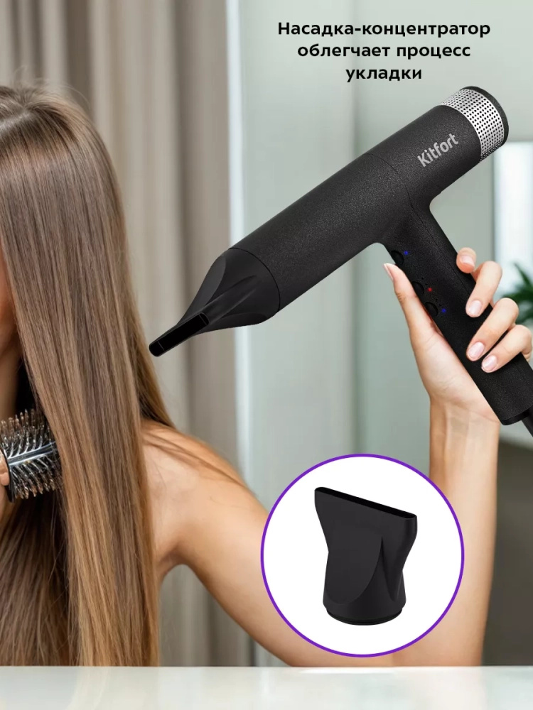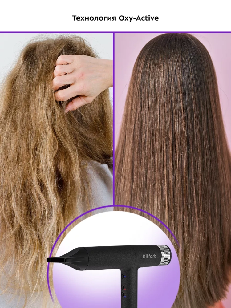 С помощью фена Kitfort КТ-3239 вы сможете быстро высушить волосы и сделать красивую укладку. Фен выдает направленный поток воздуха, поэтому волосы с ним сушить просто и удобно. КТ-3239 позволяет регулировать температуру и скорость потока воздуха. Вы можете установить холодный, теплый, горячий или очень горячий воздух, а также выбрать нужную скорость потока воздуха. У фена три скорости работы. Отдельная кнопка «Холодный воздух» позволяет в любой момент включить холодный воздух из любого температурного режима. Кнопка фиксируется, поэтому вам не придется ее удерживать. Корпус фена выполнен из пластика, эргономичная ручка фена удобно лежит в руке. Для укладки волос в комплекте к фену идут две насадки. Насадка-концентратор направляет поток воздуха именно на прядь волос, позволяя ей высохнуть намного быстрее, это облегчает процесс укладки. Насадка-диффузор во время сушки фиксирует волосы и помогает формировать локоны. Функция ионизации в данной модели снимает накопленное статическое электричество и разбивает влагу на маленькие частицы, которые легче и быстрее впитываются в стержни волос. Благодаря этой функции волосы становятся более гибкими, ухоженными и послушными. В данной модели фена используется технология Oxy-Active, которая позволяет дольше сохранять цвет окрашенных волос, а также придает блеск волосам благодаря воздействию активного кислорода, выделяемых феном. Активный кислород очищает кожу головы, поскольку обладает антибактериальным и противогрибковым действием. Он также насыщает кожу головы кислородом, который способствует росту волос. Функция самоочистки позволит без лишних усилий очищать устройство, а также обеспечивает ему более долгий срок эксплуатации. Уровень шума в данной модели ниже, чем у большинства других моделей, а также звук мотора звучит менее раздражающе. Функция памяти настроек позволит включать устройство с выставленными ранее настройками, так вам не придется каждый раз заново выставлять удобные настройки.