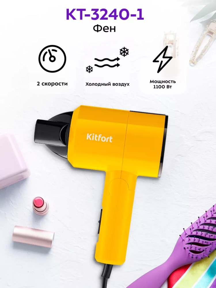 Фен для волос Kitfort КТ-3240 — это идеальный выбор для создания профессиональных укладок в домашних условиях. Этот мощный фен с мощностью 1100 Вт и двумя скоростями работы позволяет быстро и эффективно сушить волосы, создавая любой образ. Благодаря складной ручке, фен становится компактным и удобным для хранения и транспортировки, что делает его отличным дорожным вариантом.