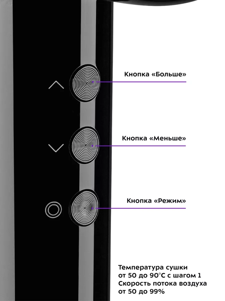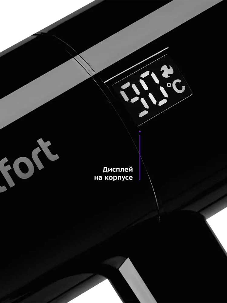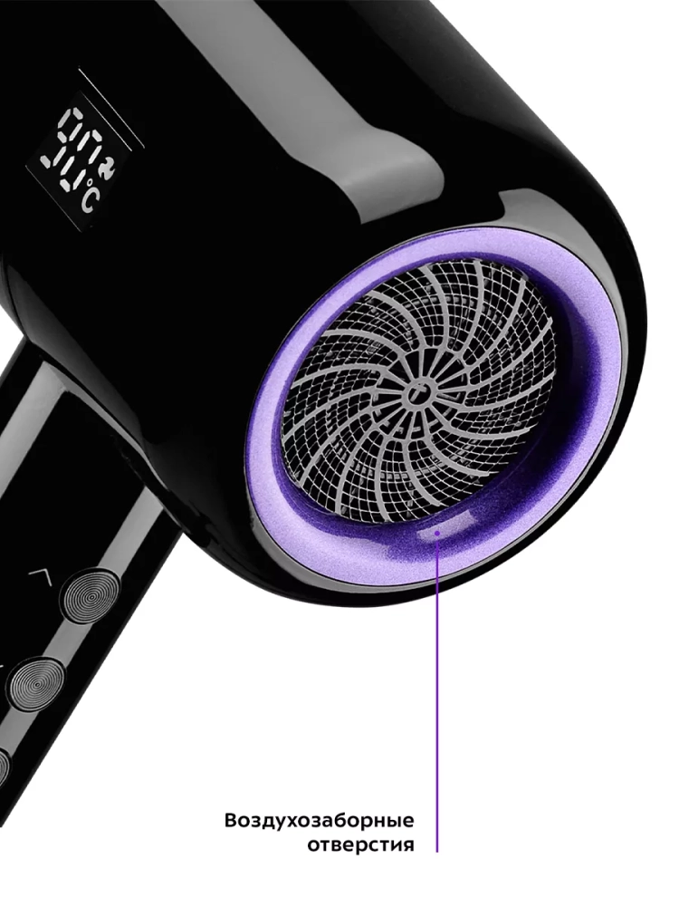 Фен оснащен дисплеем, на котором отображается температура потока горячего воздуха, а так же скорость работы в процентах, от 50 до 99%.
