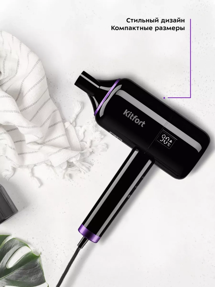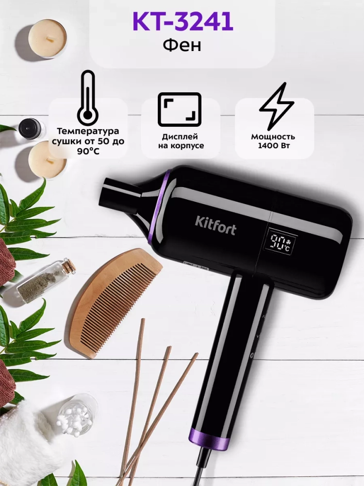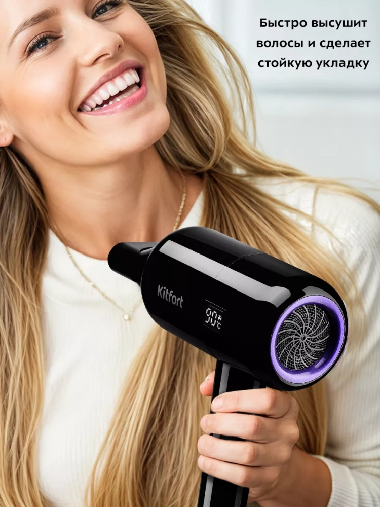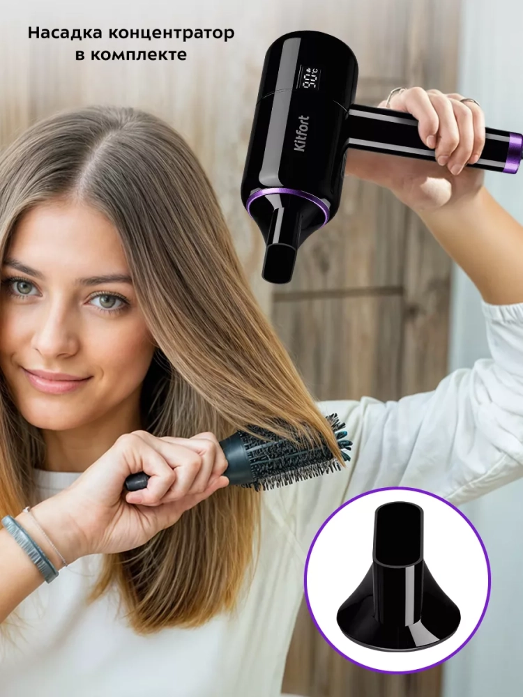 С помощью фена Kitfort КТ-3241 вы сможете быстро высушить волосы и сделать красивую укладку. Фен выдает направленный поток воздуха, поэтому волосы с ним сушить просто и удобно.