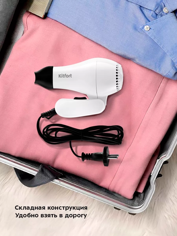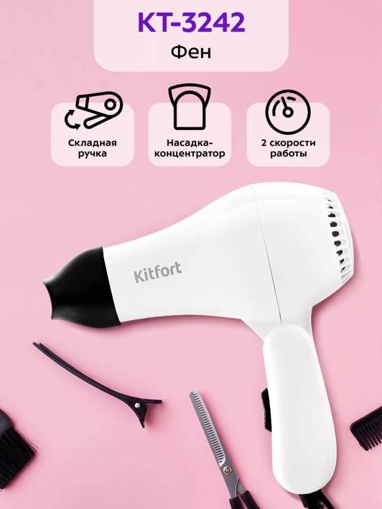 Фен КТ-3242 легкий и имеет складную ручку, что делает его компактным и удобным при хранении. В комплекте к устройству насадка-концентратор. Данную модель удобно брать с собой в поездки, путешествия и рабочие командировки.