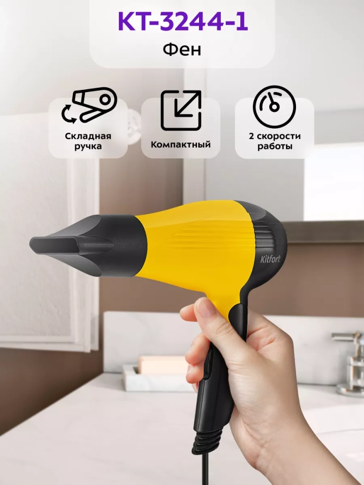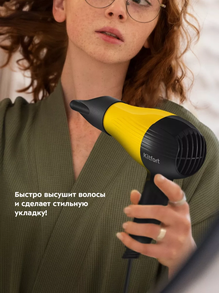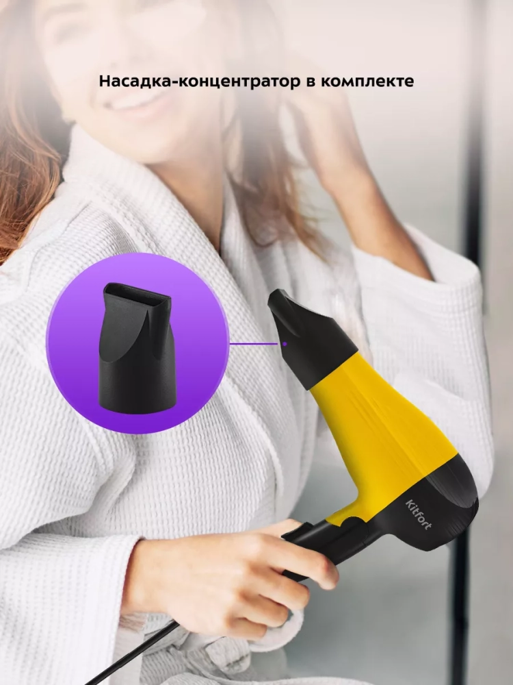 С помощью фена Kitfort КТ-3244 вы сможете быстро высушить волосы и сделать красивую укладку. Фен выдает направленный поток воздуха, поэтому волосы с ним сушить просто и удобно.