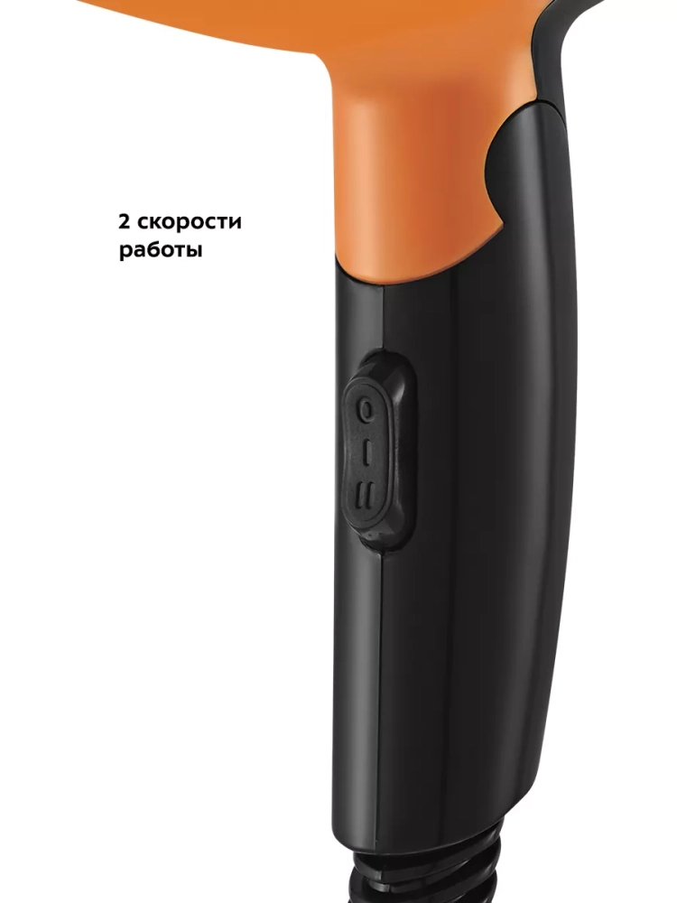 Устройство имеет две скорости потока воздуха. Корпус фена выполнен из пластика, эргономичная ручка удобно лежит в руке.