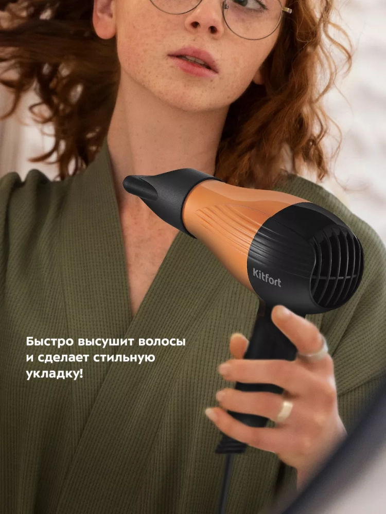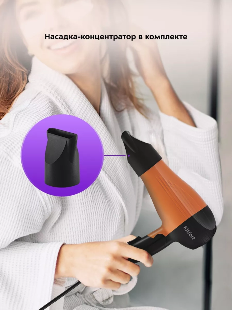 С помощью фена Kitfort КТ-3244 вы сможете быстро высушить волосы и сделать красивую укладку. Фен выдает направленный поток воздуха, поэтому волосы с ним сушить просто и удобно.