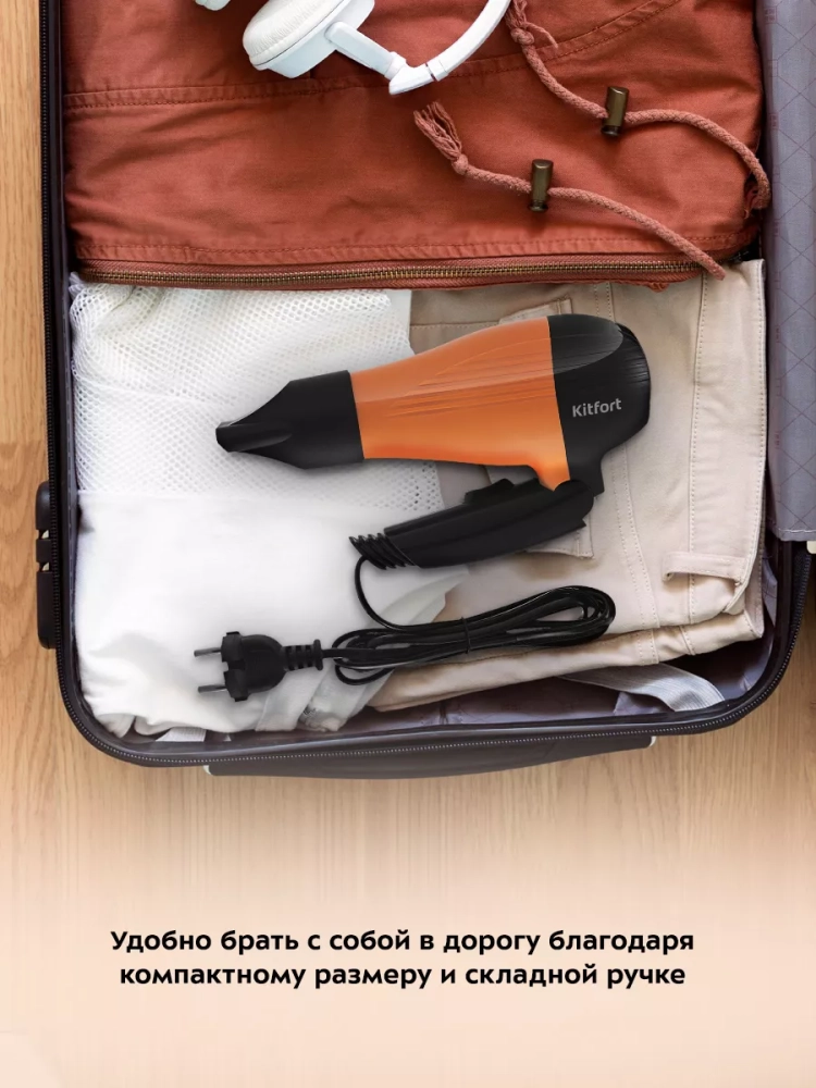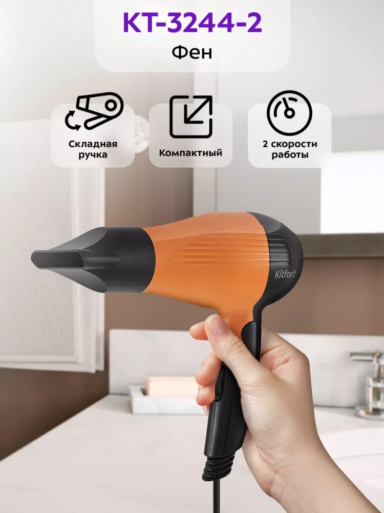 Фен КТ-3244 легкий и имеет складную ручку, что делает его компактным и удобным при хранении. В комплекте к устройству насадка-концентратор. Данную модель удобно брать с собой в поездки, путешествия и рабочие командировки.