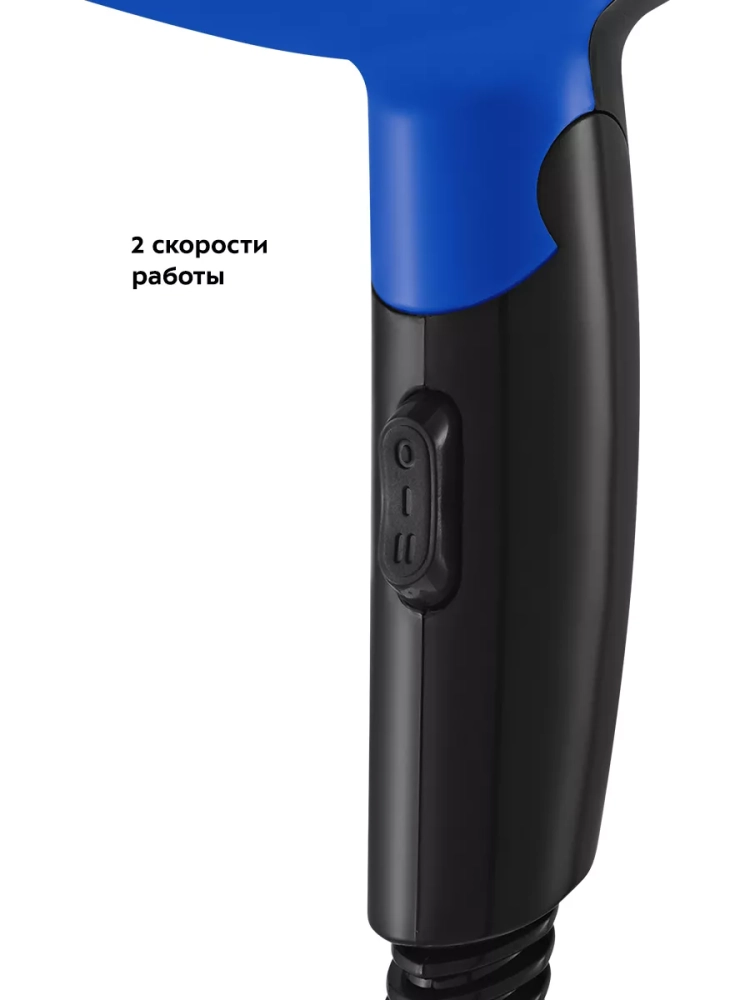 Устройство имеет две скорости потока воздуха. Корпус фена выполнен из пластика, эргономичная ручка удобно лежит в руке.