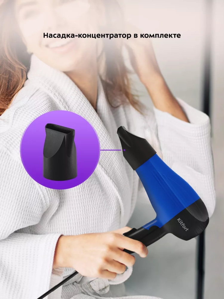 С помощью фена Kitfort КТ-3244 вы сможете быстро высушить волосы и сделать красивую укладку. Фен выдает направленный поток воздуха, поэтому волосы с ним сушить просто и удобно.