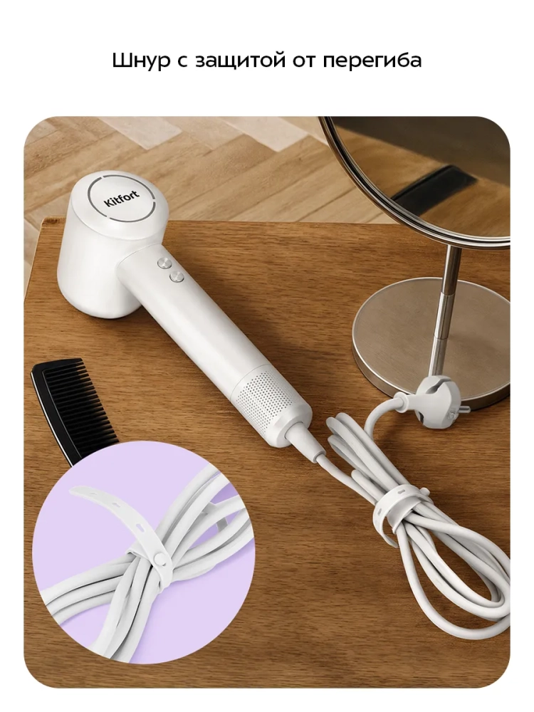 Фен КТ-3295 легкий, его эргономичная ручка удобно лежит в руке. Благодаря небольшому весу и компактному корпусу фен не занимает много места при хранении, его удобно брать с собой в поездки, путешествия или рабочие командировки. Шнур фена оснащен защитой от перегиба, что увеличивает срок службы прибора.