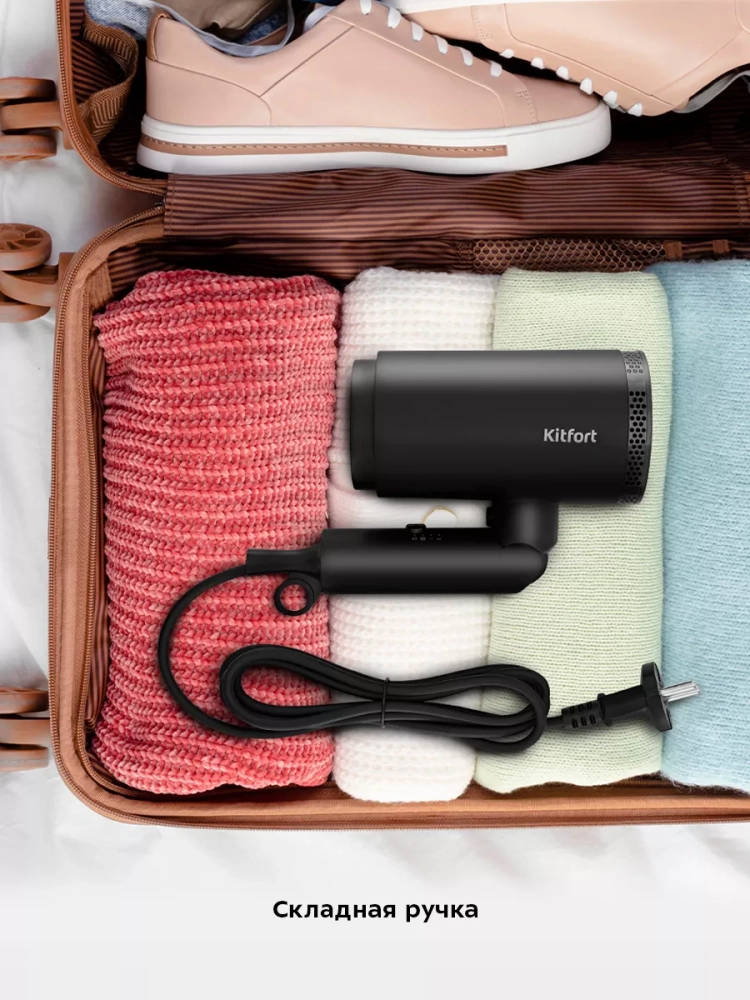 Для удобства хранения и транспортировки ручка фена сделана складной. Шнур оснащен защитой от перегиба, что увеличивает срок службы прибора. На защите от перегиба находится петля, за которую удобно повесить устройство при хранении.