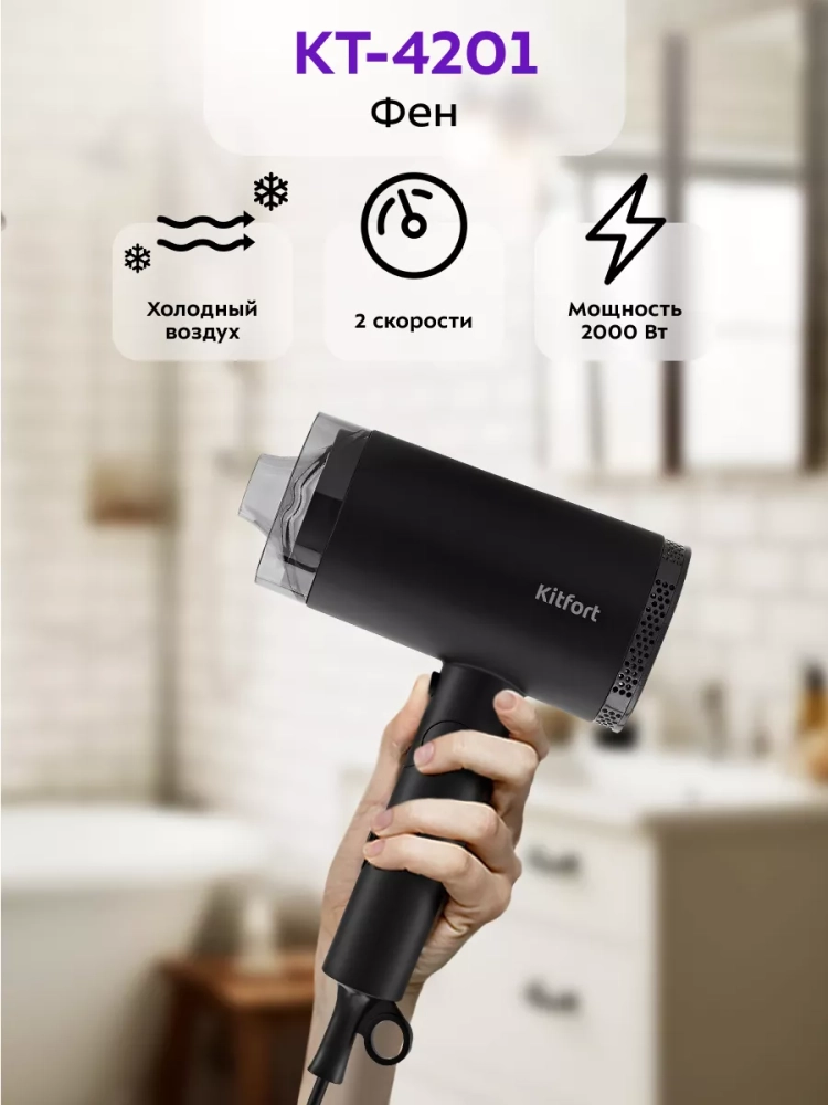 Фен позволяет регулировать скорость потока воздуха. У фена КТ-4201 две скорости и три температурных режима. Также данная модель оснащена кнопкой подачи холодного воздуха, с помощью которой удобно подавать холодный воздух для закрепления укладки.