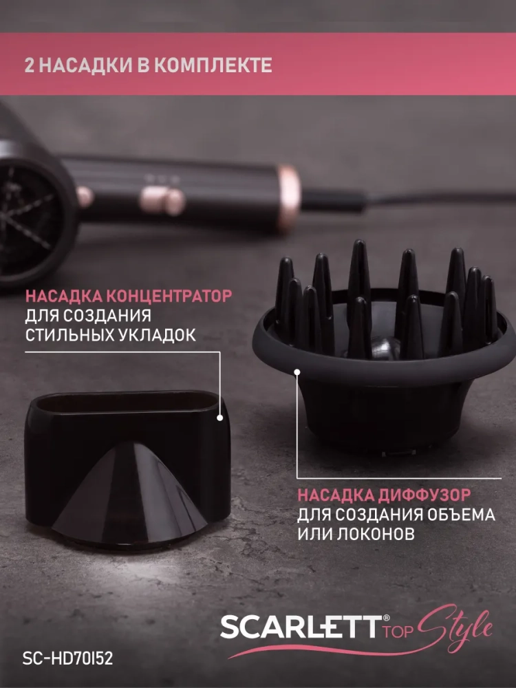В комплект входят несколько насадок - концентратор, который направляет поток воздуха на небольшую площадь и быстрее сушит волосы, диффузор для создания самых разных укладок. Насадка-диффузор безопасна и проста в использовании, идеальна для бережной сушки волос так как из-за большой площади воздействия воздушный поток рассеивается и не направляется непосредственно на корни волос и кожу головы.