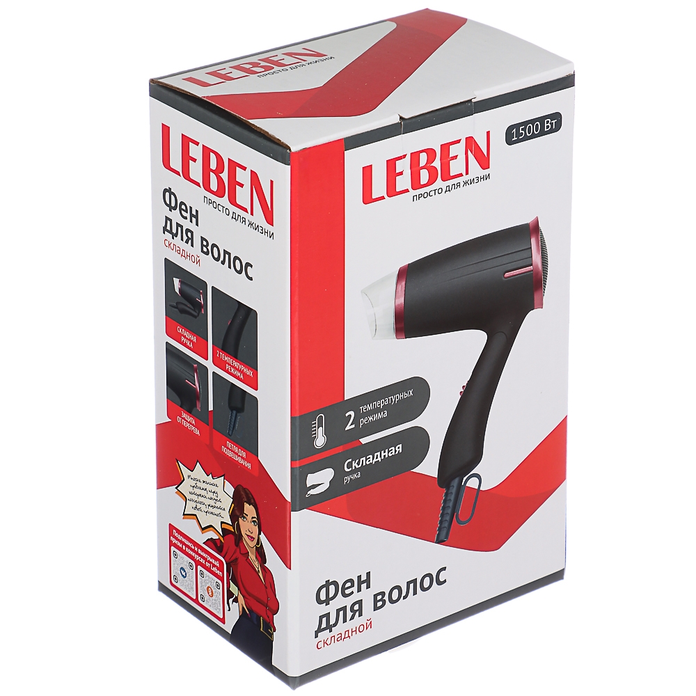 Складной фен для волос LEBEN мощностью 1500 Вт имеет компактный размер за счет складывающейся ручки, поэтому без труда уместится даже в небольшую дорожную сумку или чемодан. Работает в 2-х температурных режимах. Оснащен насадкой концентратором, которая направляет воздух точно к выбранной пряди, позволяя сделать аккуратную красивую укладку. Предусмотрена защита от перегрева. Петля для подвешивания обеспечит удобство во время хранения.