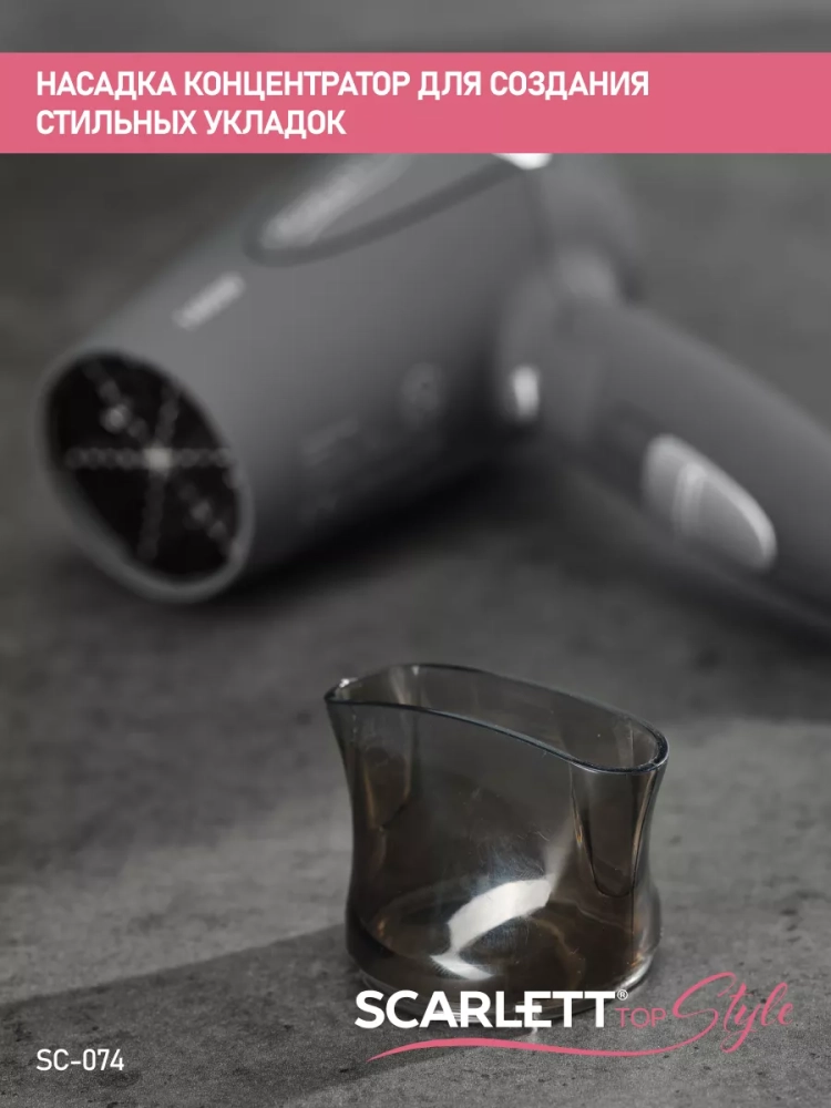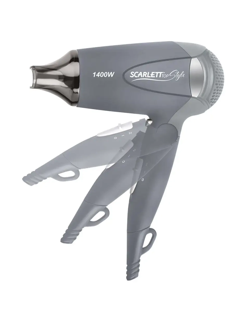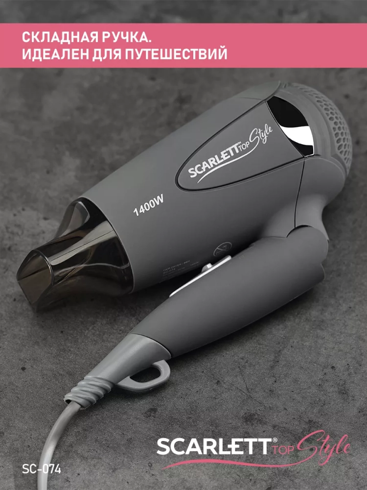 Фен Scarlett TOP STYLE SC-074, выполненный в нежных тонах, станет лучшим решением для всевозможных поездок - благодаря складной ручке он почти не занимает места в чемодане