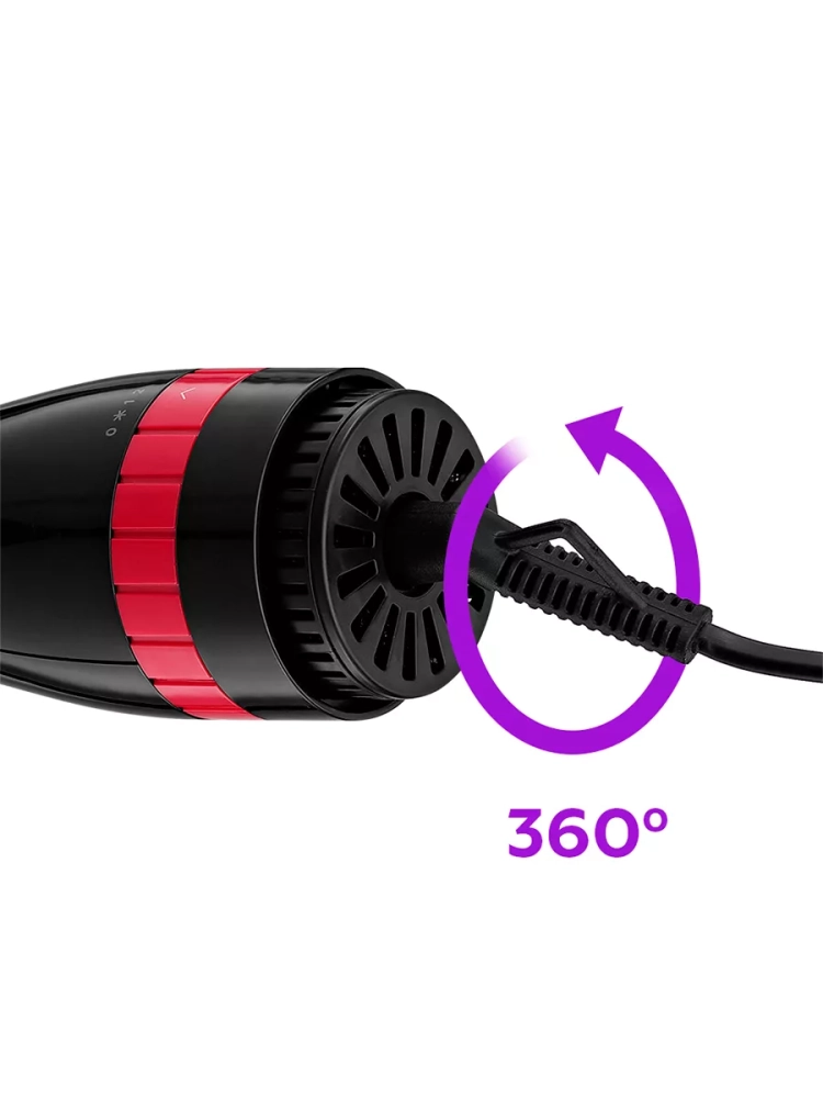 Корпус фена-щетки выполнен из пластика и удобно лежит в руке. Шнур питания вращается на 360° и оснащен защитой от перегиба, что увеличивает срок службы устройства. На защите от перегиба находится петля для хранения, которая позволяет хранить фен-щетку на крючке.
