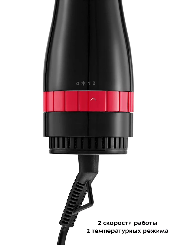 Для удобства использования фен-щетка КТ-3266 имеет 2 скорости работы и 2 температурных режима. У переключателя скорости и температуры всего 4 положения — фен-щетка выключен, высокая скорость и холодный воздух, низкая скорость и горячий воздух, высокая скорость и горячий воздух.