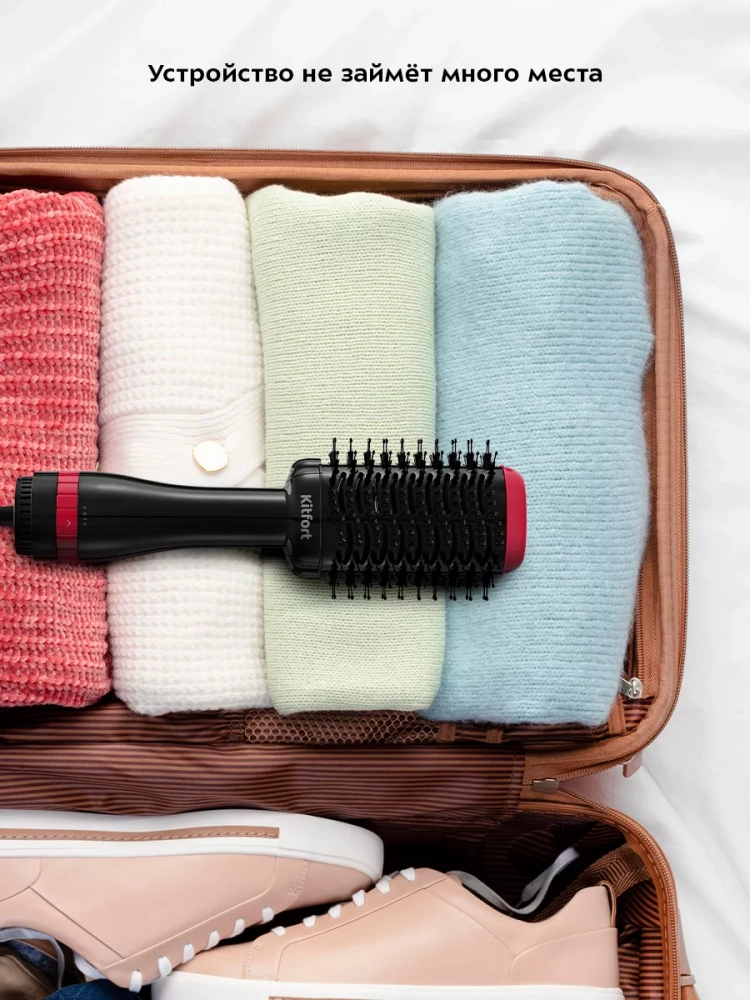 Фен-щетка Kitfort КТ-3266 поможет быстро высушить ваши волосы и сделать укладку. Благодаря круглой щетке вы сможете с легкостью уложить челку, создать прикорневой объем и легкие локоны. На корпус щетки нанесено керамическое покрытие, которое бережно выравнивает структуру волос, делая их гладкими и блестящими, а также снимает статическое электричество.