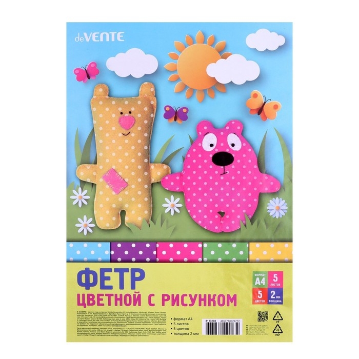 Фетр цветной мягкий с рисунком A4 "deVENTE. Горошек" 5 цветов, 5 листов, толщина 2 мм, пластиковый пакет с европодвесом