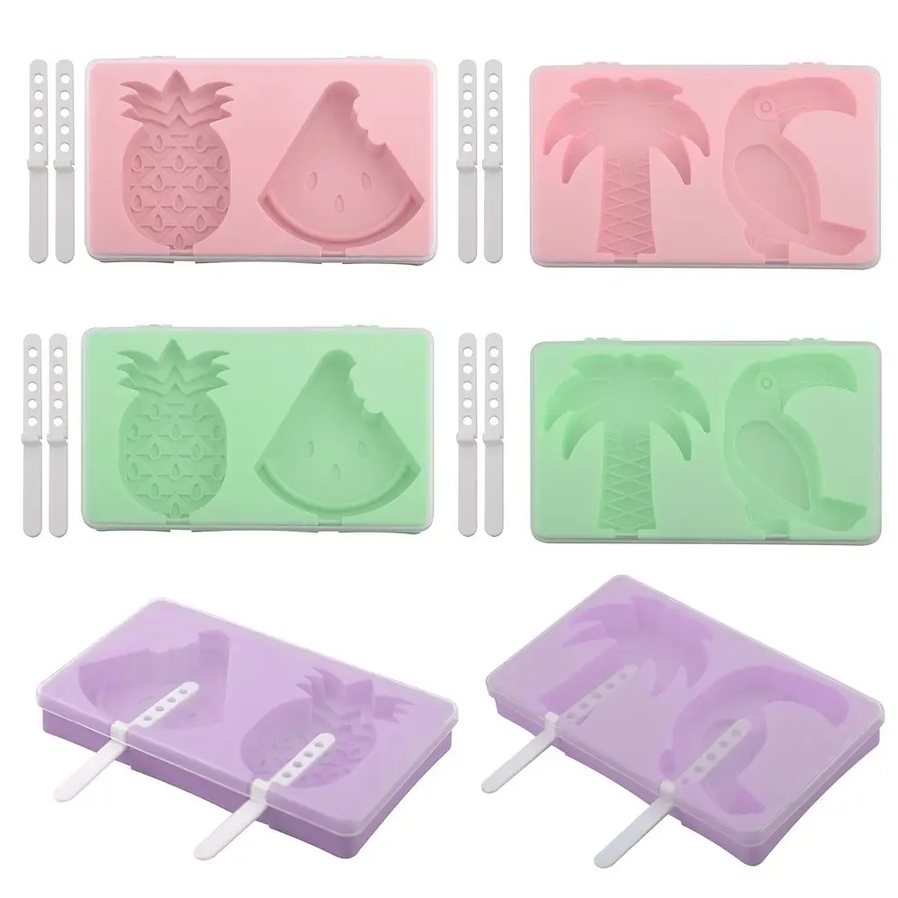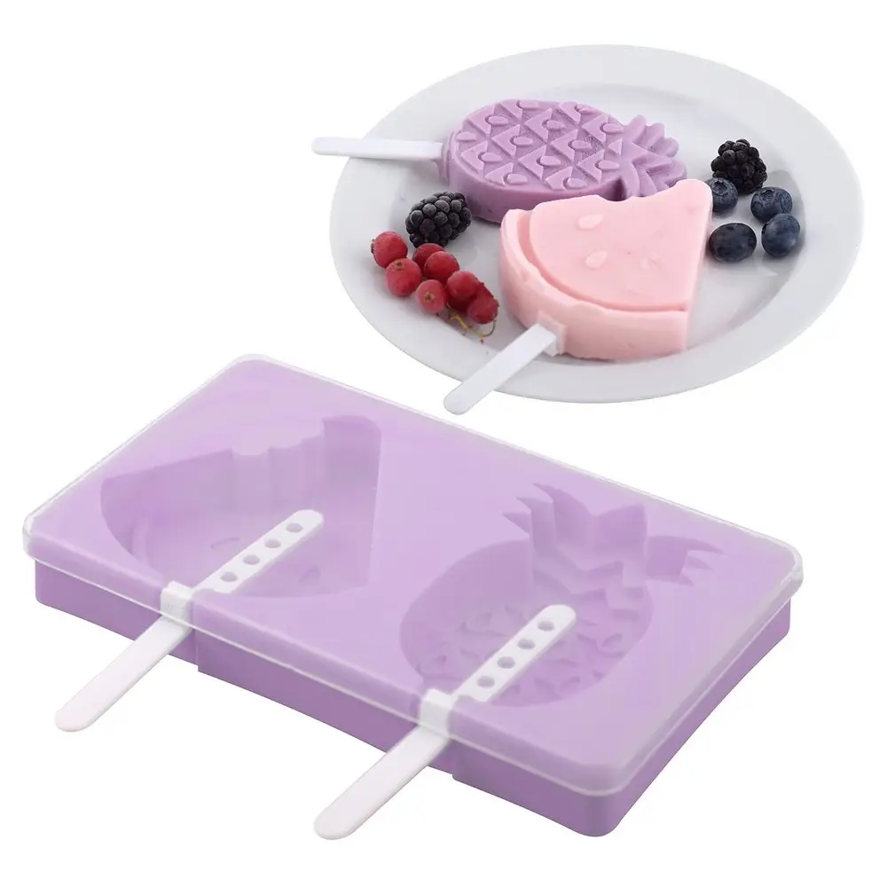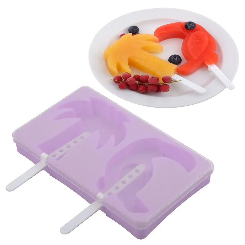 Домашнее мороженое или фруктовый лед — отличное угощение для вечеринки или праздничного стола. Готовьте мороженое из любимых ингредиентов, проявляйте фантазию и экспериментируйте. Формы выполнены в оригинальном тропическом дизайне, поэтому мороженое получится не просто вкусным, но и очень красивым! Форма имеет две ячейки, таким образом вы сможете одновременно приготовить две порции. В комплект входит: форма для мороженого с крышкой – 1шт., палочки-держатели – 2шт. Зафиксируйте палочки-держатели на форме таким образом, чтобы область с перфорацией находилась внутри формы. Поместите заранее подготовленные ингредиенты в форму и распределите их равномерно. Закройте крышку и положите изделие горизонтально в морозильную камеру. После заморозки аккуратно извлеките мороженое и наслаждайтесь вкусом! После использования промыть губкой с моющим средством. Изготовлено из пластмассы (полипропилен). Размеры: форма 19х11х2,5 см, палочка-держатель – длина 11 см.