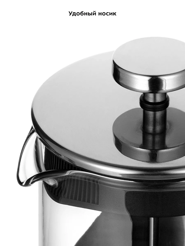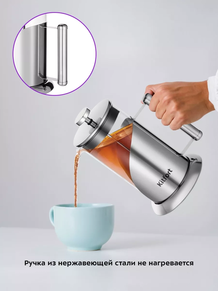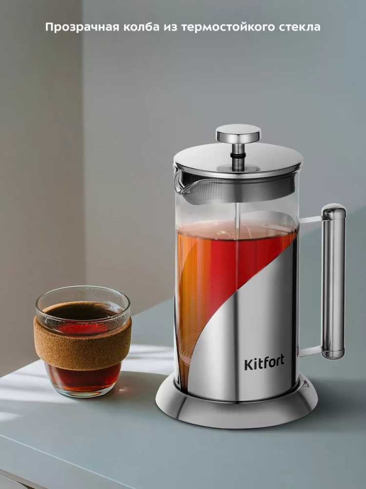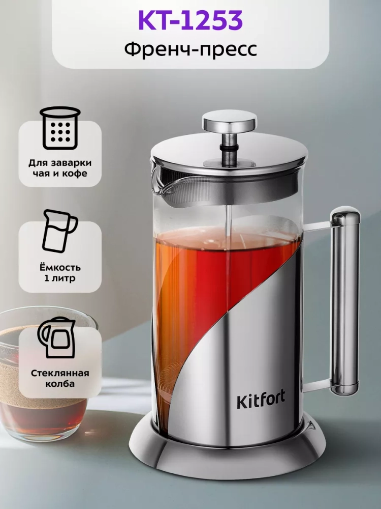 Френч-пресс Kitfort KT-1253 предназначен для приготовления кофе или чая иммерсионным способом, при котором чайные листья или молотый кофе заливают горячей водой и заваривают в колбе в течение нескольких минут, а затем прижимают сверху прессом. За счет времени заваривания вы можете регулировать крепость напитка: чем дольше экстракция, тем крепче кофе или чай. На крепость напитка также влияет давление пресса, который утрамбовывает кофейную гущу или чайную заварку на дне колбы. Пресс опускается с помощью плунжера и состоит из двух прижимных пластин и фильтра, который представляет собой металлическое ситечко. В крышке колбы есть дополнительный фильтр в виде пластиковой решетки.
