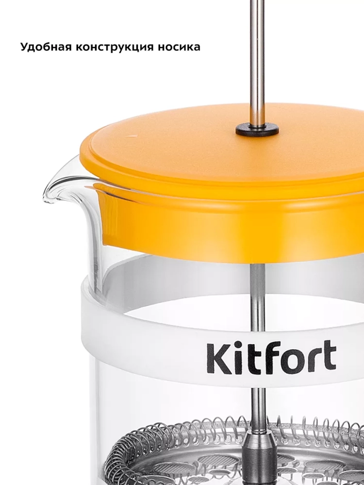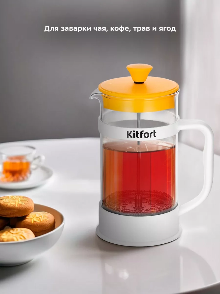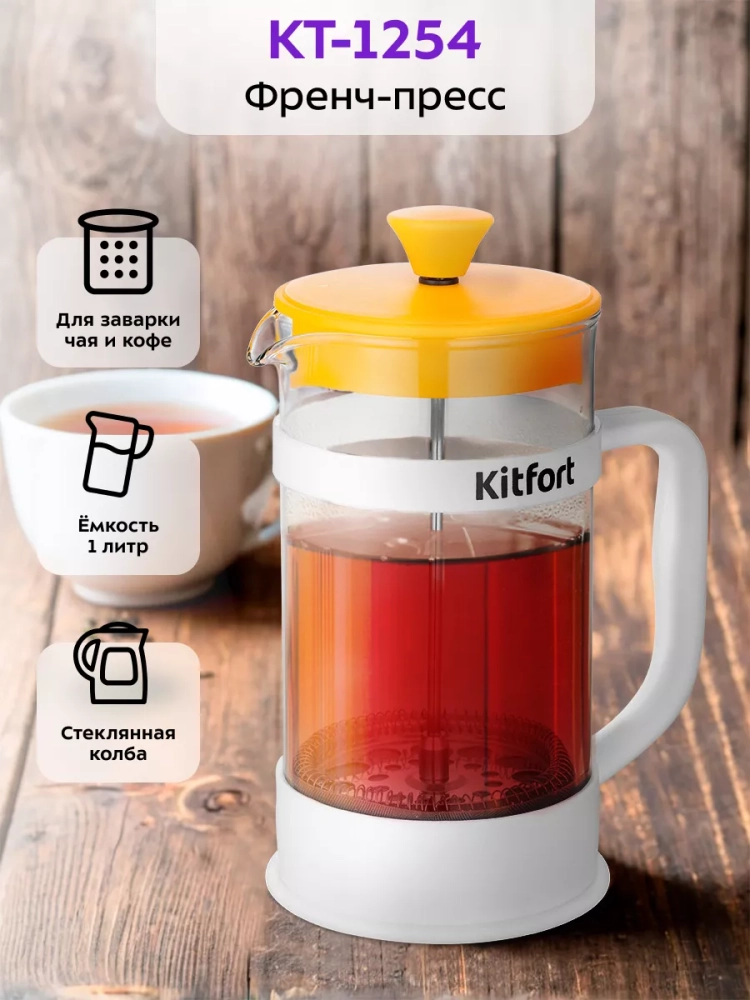 Френч-пресс Kitfort KT-1254 предназначен для приготовления кофе или чая иммерсионным способом, при котором чайные листья или молотый кофе заливают горячей водой и заваривают в колбе в течение нескольких минут, а затем прижимают сверху прессом. Пресс опускается с помощью плунжера и состоит из двух прижимных пластин и фильтра, который представляет собой металлическое ситечко. За счет времени заваривания вы можете регулировать крепость напитка: чем дольше экстракция, тем крепче кофе или чай. На крепость напитка также влияет давление пресса, который утрамбовывает кофейную гущу или чайную заварку на дне колбы. В крышке колбы есть дополнительный фильтр в виде пластиковой решетки.