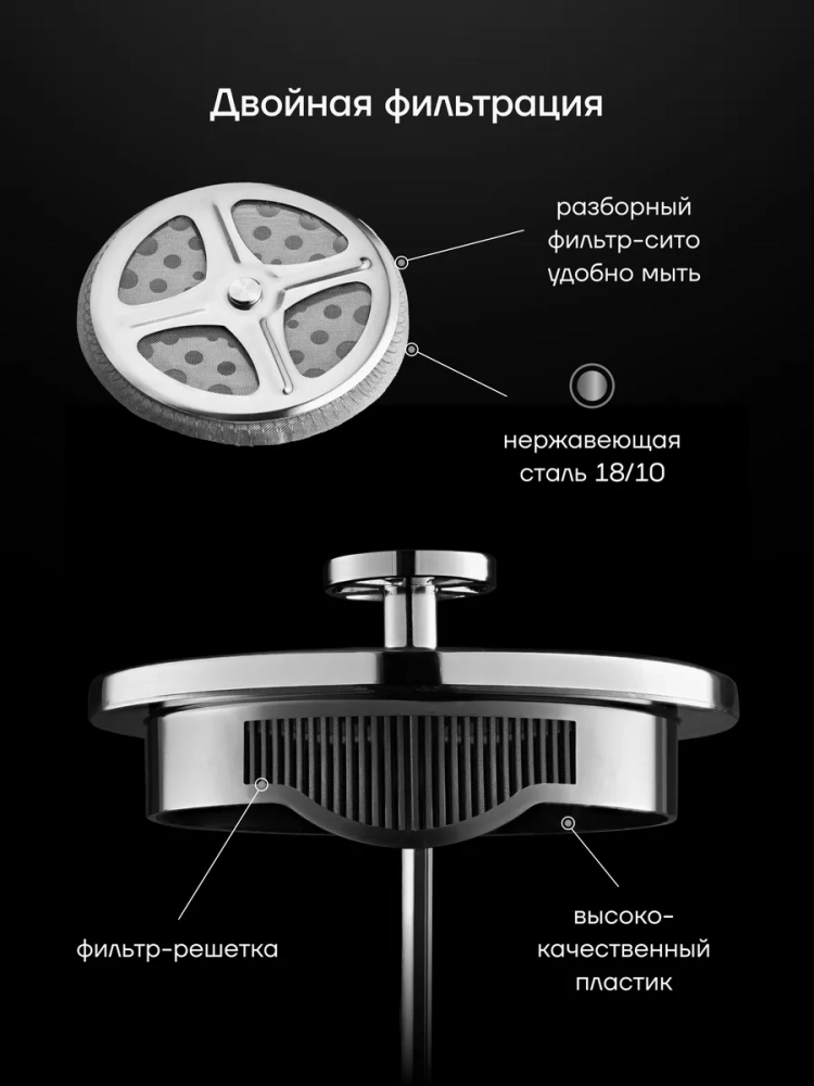 Эргономичный поршень изготовлен из нержавеющей стали 18/10, что гарантирует его долговечность и гигиеничность. Материал устойчив к коррозии и обладает антибактериальными свойствами, препятствуя размножению вредных микроорганизмов. В отличие от алюминия, нержавеющая сталь обеспечивает максимальную безопасность и гигиеничность.