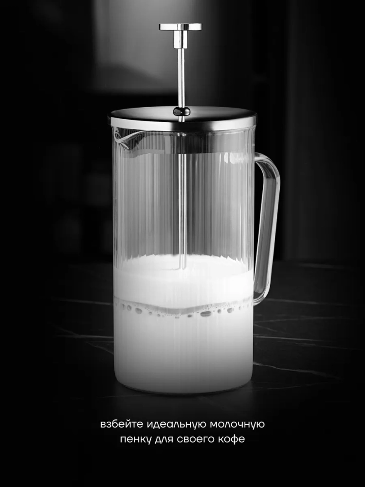 Термостойкий корпус пресса выполнен из жаропрочного односоставного стекла и имеет уникальный дизайн с волнистым обрамлением, придающий ему изысканный и элегантный вид. Эта особенность не только украшает френч-пресс, но и делает его более удобным в использовании. Внутри колбы расположен эргономичный поршень, изготовленный из медицинской нержавеющей стали 18/10, устойчивой к коррозии и обладающей антибактериальными свойствами, что предотвращает размножение микроорганизмов. В отличие от алюминиевых изделий, стальной поршень обеспечивает более гигиеничное использование. Большой объем посуды (1100 мл) позволяет заварить напиток для всей семьи. Для удобства использования в комплекте присутствует мерная ложка.