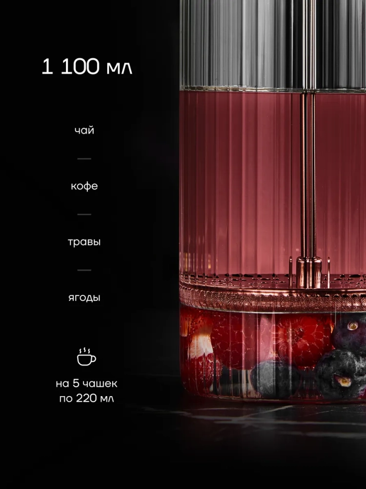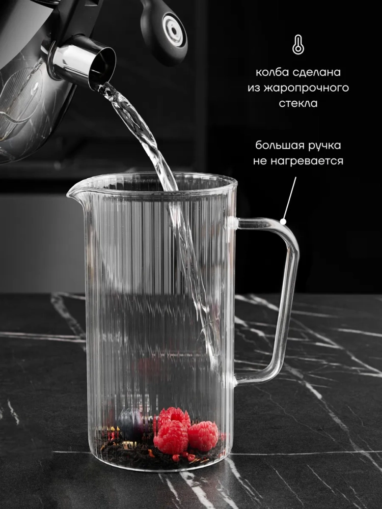 Металлический сетчатый фильтр гарантирует эффективную фильтрацию напитков, что позволяет использовать мелко измельченные ингредиенты при заваривании. Прочное ситечко легко чистится и остается в идеальном состоянии на протяжении долгого времени. Ручка из жаропрочного стекла не нагревается и обеспечивает надёжную хватку и безопасность во время использования. Крышка выполнена из высококачественного пластика, который устойчив к царапинам, что обеспечивает долгий срок службы и привлекательный внешний вид. Удобный носик предотвращает проливание напитков на стол, гарантируя безопасное наливание.