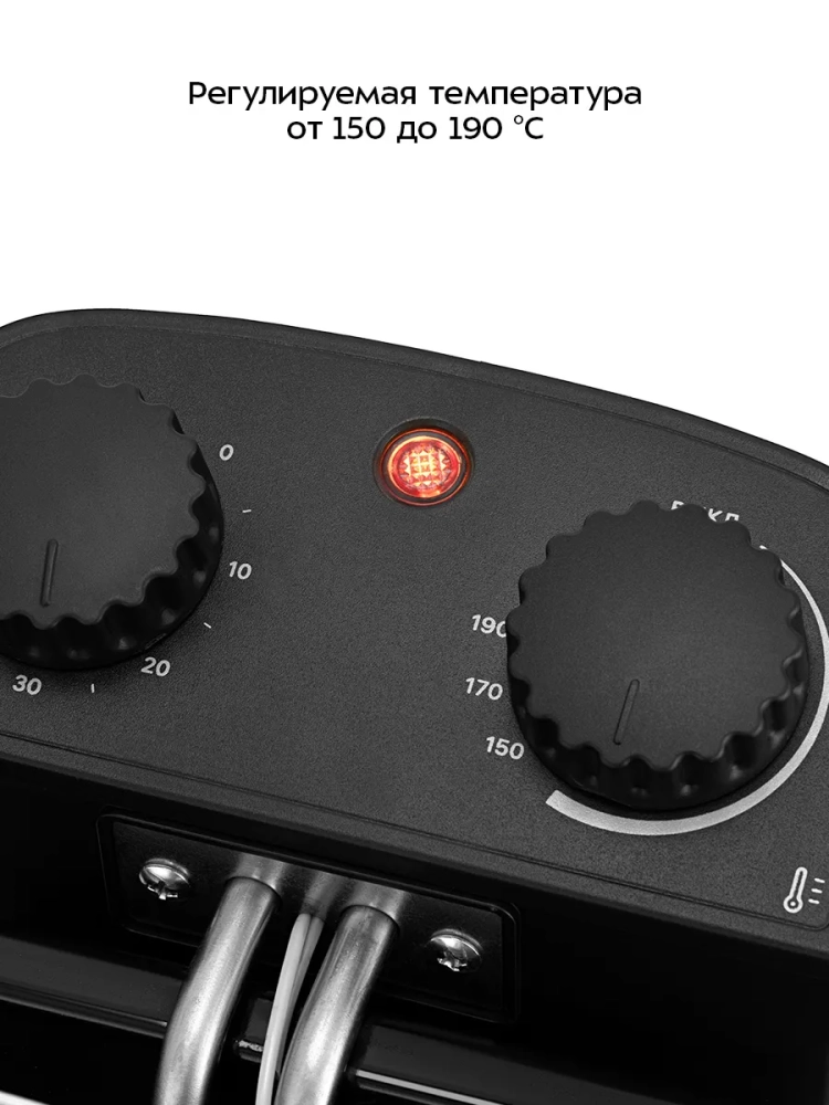 С помощью регулятора температуры можно установить температуру нагрева 150–190 °С. С помощью регулятора таймера устанавливается таймер до 60 минут.