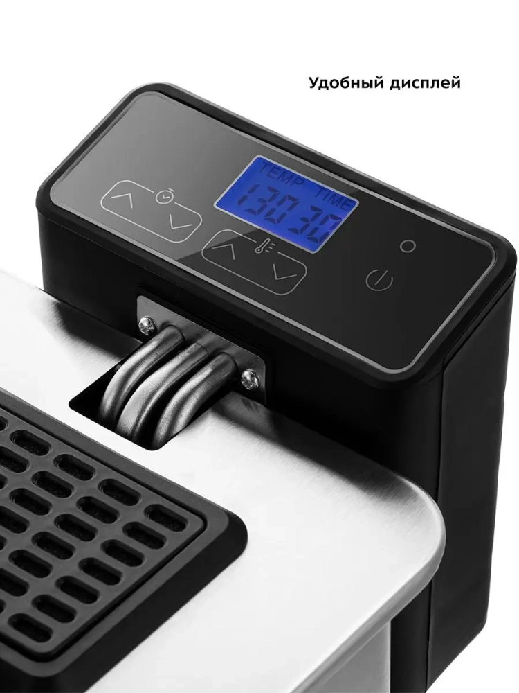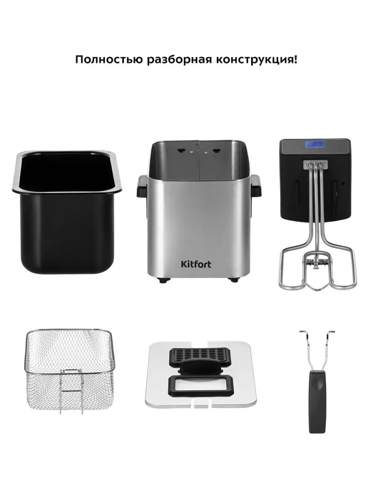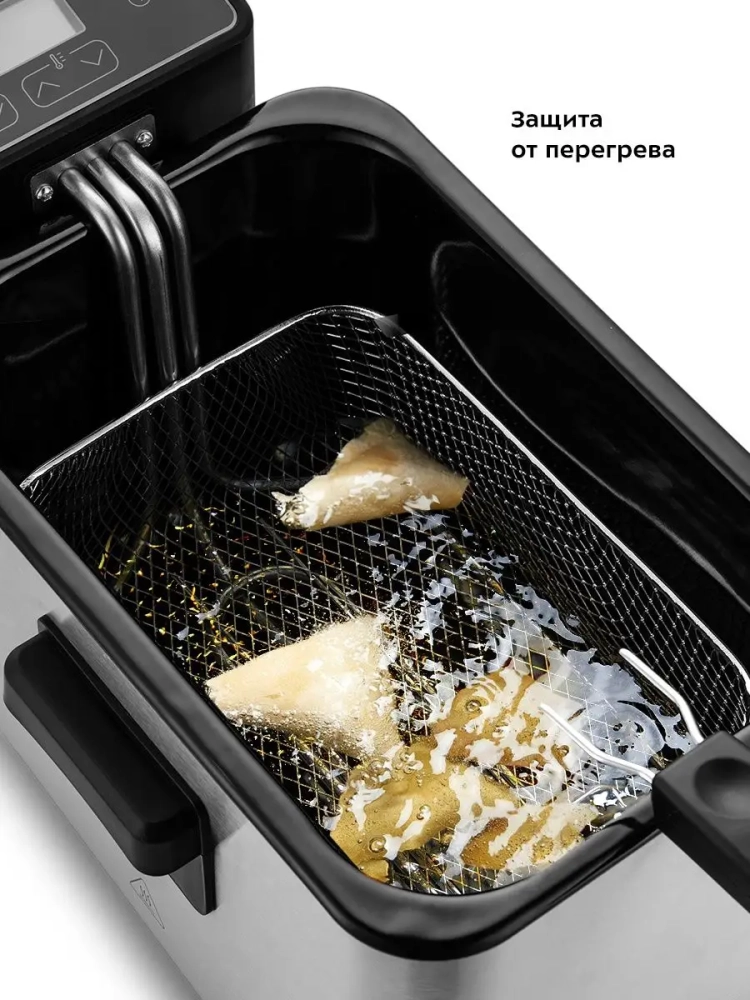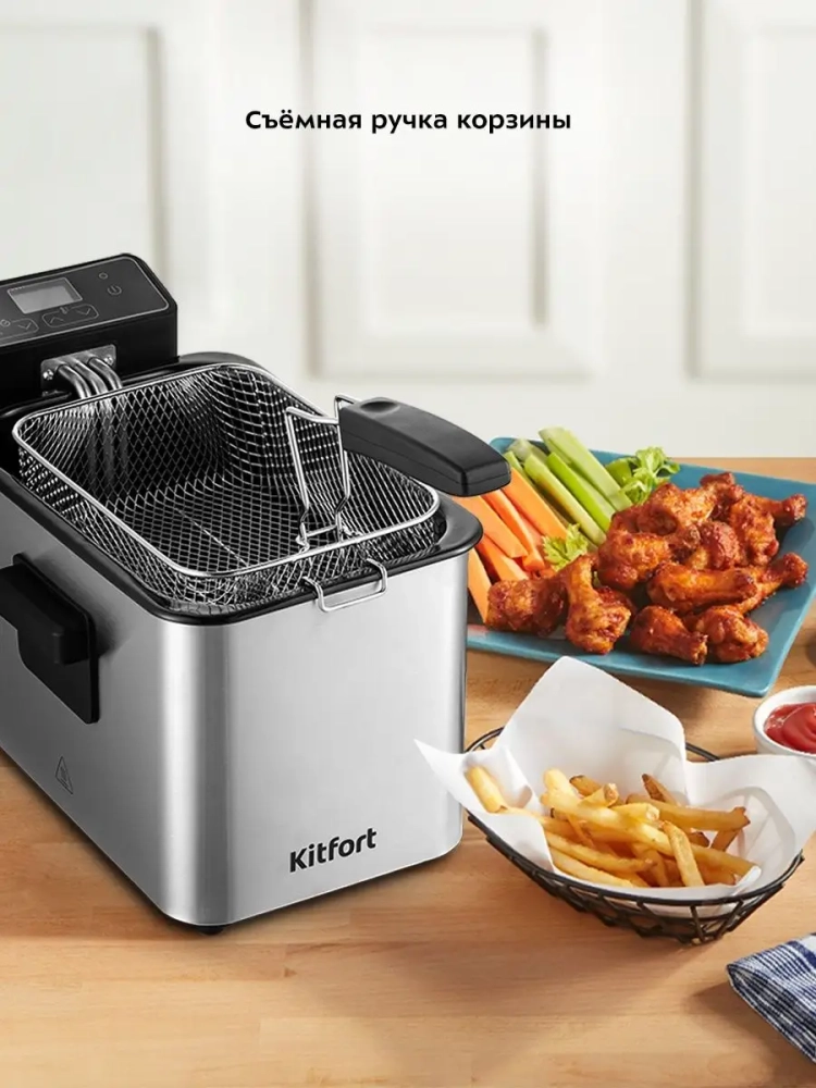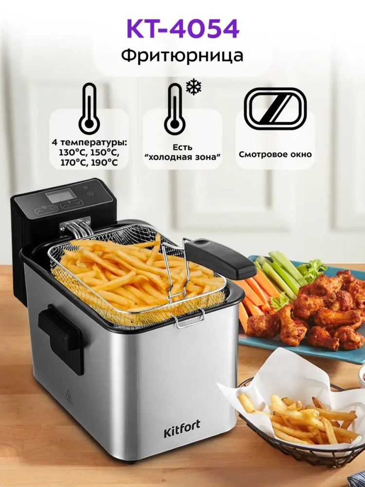Во фритюрнице Kitfort КТ-4054 продукты жарятся в глубоком слое горячего масла. Продукты во фритюре готовятся быстрее, чем на сковороде из-за короткого воздействия высокой температуры со всех сторон. Несмотря на то, что продукты готовятся в масле, в жаренных во фритюре продуктах масла обычно содержится меньше, чем в жаренных на сковороде. Хорошо зажаренные во фритюре продукты покрыты хрустящей корочкой, под которой почти нет масла. Во фритюре можно готовить картофель фри и картофель по-деревенски, чипсы, овощи, рыбу, мясо и птицу, куриные окорочка и крылышки, креветки. Все это можно жарить в кляре и без кляра. Кроме этого, можно жарить котлеты, чебуреки, пельмени, фрикадельки, пирожки, беляши, пышки, пончики и многое другое, например, луковые кольца, кольца кальмаров, грибы и даже соленья. У фритюрницы есть «холодная зона» — это зазор между чашей и нагревателем. Чем он больше, тем меньше греется корпус. Рекомендуется периодически, перед очередной закладкой продуктов, фильтровать масло или удалять осадки со дна чаши фритюрницы. С помощью кнопок на панели управления вы можете устанавливать таймер и температуру приготовления. Время таймера и температура будут отображаться на дисплее устройства. Фритюрница КТ-4054 укомплектована корзиной для жарки. Боковые ручки, ручки крышки и корзины выполнены из термостойкой пластмассы. Для экономии места при хранении предусмотрена съемная ручка корзины. Корпус, крышка и корзина выполнены из нержавеющей стали. Крышка фритюрницы является съемной, поэтому ее легко мыть. Устройство имеет отсек для хранения шнура питания. В крышке фритюрницы имеется смотровое окно, через которое вы сможете следить за степенью готовности блюда, не поднимая крышку. Блок управления с нагревателем просто снимается с фритюрницы, чтобы появилась возможность достать чашу и вымыть ее. У фритюрницы есть защита от перегрева. При перегреве сработает термостат, который отключит фритюрницу.