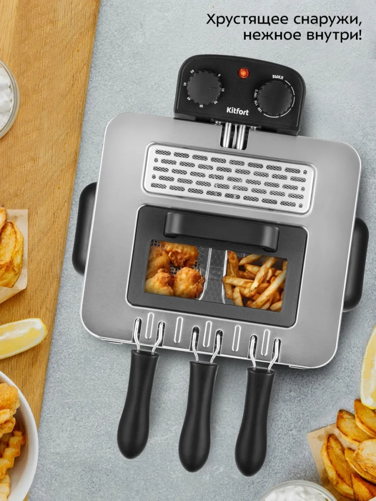 Электрическая фритюрница Kitfort — это выбор тех, кто ценит качество и функциональность. Она станет незаменимой частью вашей кухни, обеспечивая простоту и удобство в приготовлении любимых блюд. Хранение и чистка фритюрницы не требуют много времени благодаря съемной чаше и корзине.