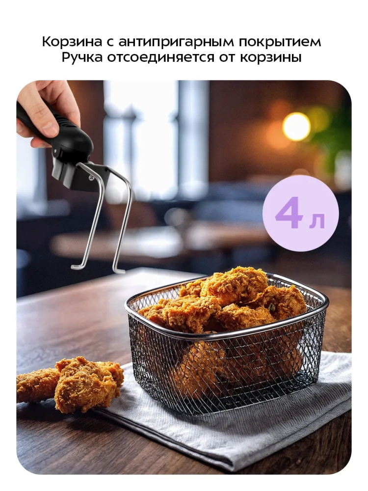 В комплекте есть корзина для жарки. Для удобства хранения ручка корзины съемная.