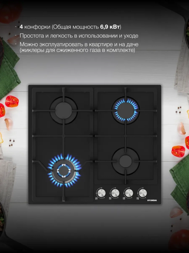 Чугунные решетки придают устройству прочность и устойчивость, выдерживая даже тяжелую посуду. Переходники для подключения сжиженного газа входят в комплект, что делает Hyundai HHG 6434 BG универсальной и подходящей для использования не только в городской квартире, но и на даче.