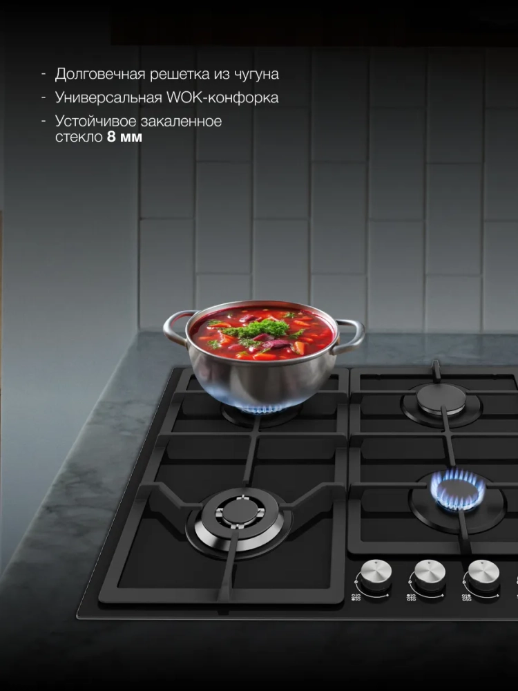 Четыре газовые конфорки, включая WOK-конфорку, обеспечат высокую гибкость в приготовлении различных блюд. Конструкция также включает конфорки с мощностью от 900 до 2500 Вт, что позволяет легко готовить блюда с разными температурными режимами. Общая мощность конфорок составляет 6800 Вт.