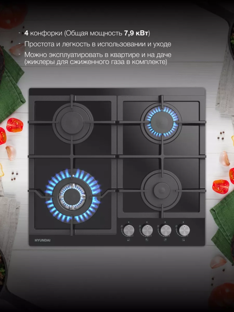 Поверхность выполнена из закаленного стекла черного цвета. Чугунные решетки обеспечивают надежную опору для посуды и просты в уходе. Поворотные переключатели выполнены из металла. Автоматический электроподжиг позволяет легко и безопасно включать конфорки.