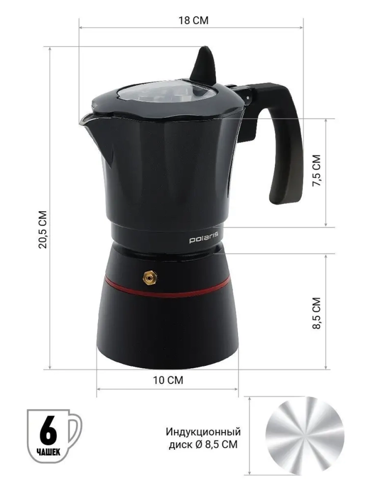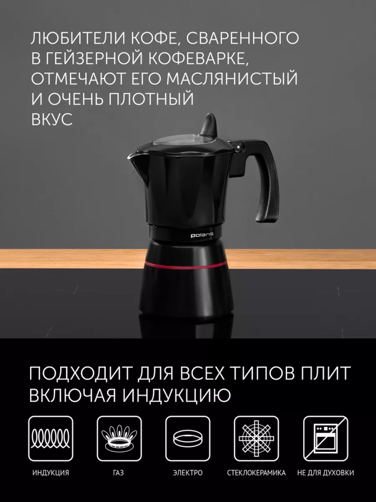 Благодаря технологии 360° TURBO INDUCTION, кофеварка Polaris гарантирует максимальную скорость нагрева и доступно для использования на газовой, керамической, электрической и индукционной плите.