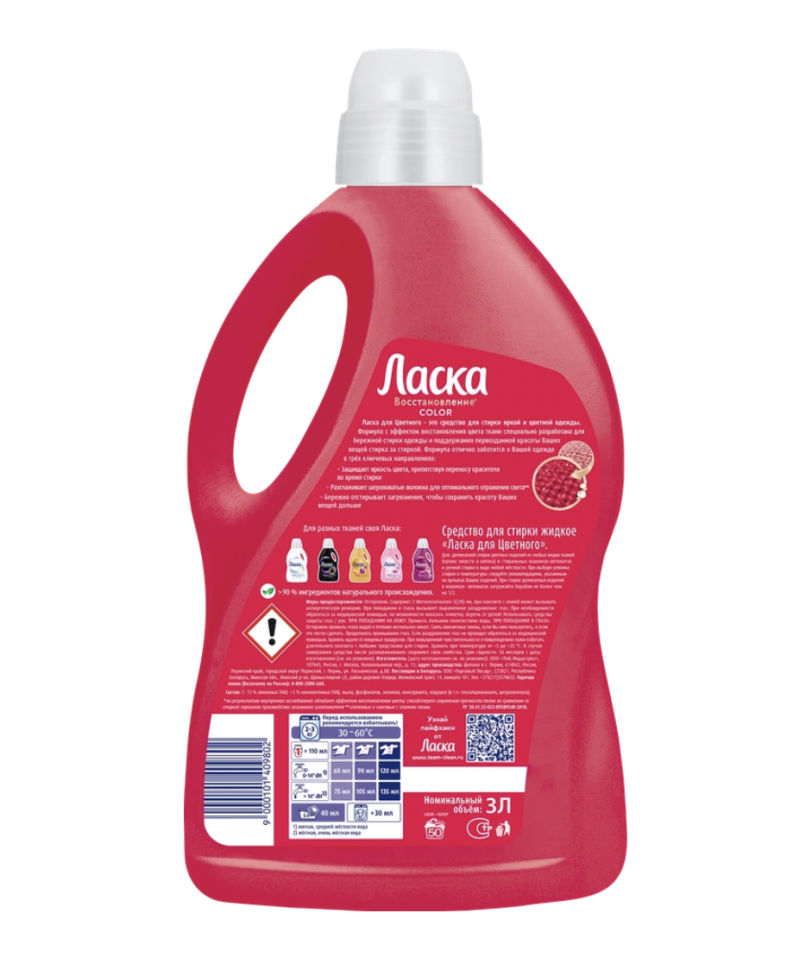 В упаковке 93x192x342 мм (ДxШxВ), вес 3210 г Полное название товара (у поставщика) Гель для стирки цветных вещей ЛАСКА Эффект восстановления, 3л Способ применения, дозировка Засыпать необходимое количество порошка в предназначенный отсек в стиральной машине. Производитель OOO «ЛАБ Индастриз» Количество стирок 50 Условия хранения При температуре от +5 до +35. Вид упаковки Пластиковая бутылка Вид стирки Универсальный. Гель для стирки цветных вещей ЛАСКА Эффект восстановления для цветного белья. Жидкий порошок ЛАСКА Восстановление для цветного эффективно и бережно отстирывает загрязнения на одежде, восстанавливая яркость цвета и сохраняя прочность волокон ткани. В отличие от обычного стирального порошка, ЛАСКА содержит цветозащитные ингредиенты, которые поддерживают стойкость цвета одежды. Активные компоненты способствуют уменьшению количества катышков на ткани. Формула содержит более 90% ингредиентов натурального происхождения. Бережно и эффективно отстирывает загрязнения. Восстанавливает и защищает яркость цвета. Сохраняет форму ткани и препятствует появлению катышков. Не оставляет разводов. Гель ЛАСКА удобен в использовании: дозируйте жидкое средство согласно инструкции, заливайте его в отделение для стирального порошка или добавьте мерный колпачок со средством в барабан стиральной машины. Цвет геля может варьироваться от молочного до светло-розового. Состав: 5–15% анионных ПАВ, 5% неионогенных ПАВ, мыла, фосфонатов, энзимов, консерванта, отдушки (в том числе гексилциннамаля,цитронеллола).