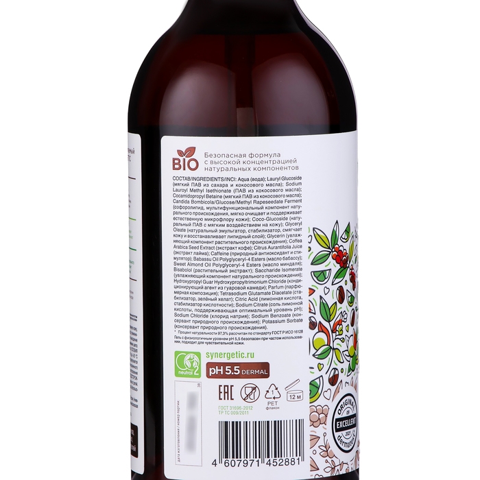 Натуральный биоразлагаемый гель для душа SYNERGETIC «Кофе и зеленый лайм» — это деликатное средство для очищения кожи, на 99,1% состоящее из натуральных компонентов. Гипоаллергенный аромат геля SYNERGETIC «Кофе и зеленый лайм» разработан в швейцарском доме Givaudan с использованием натуральных эфирных масел кедра, пачули и бархатцев.