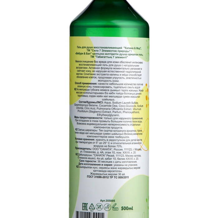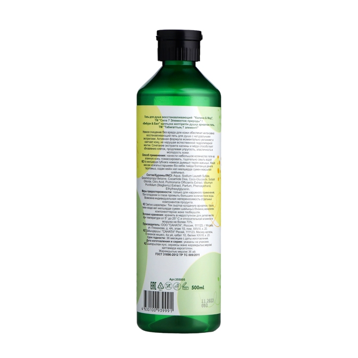 Гель для душа «Сила 7 элементов природы. Калина & Мёд» — это восстанавливающее средство для ежедневного ухода за кожей. Объём упаковки составляет 500 мл. Гель не тестируется на животных и изготовлен в России.