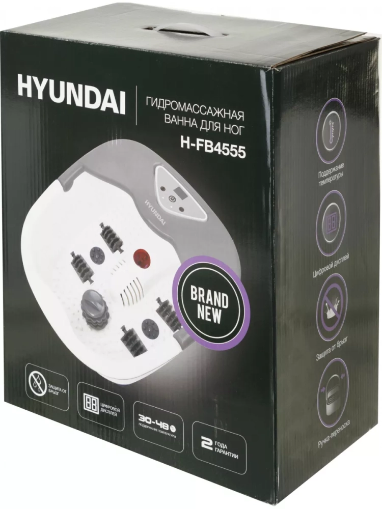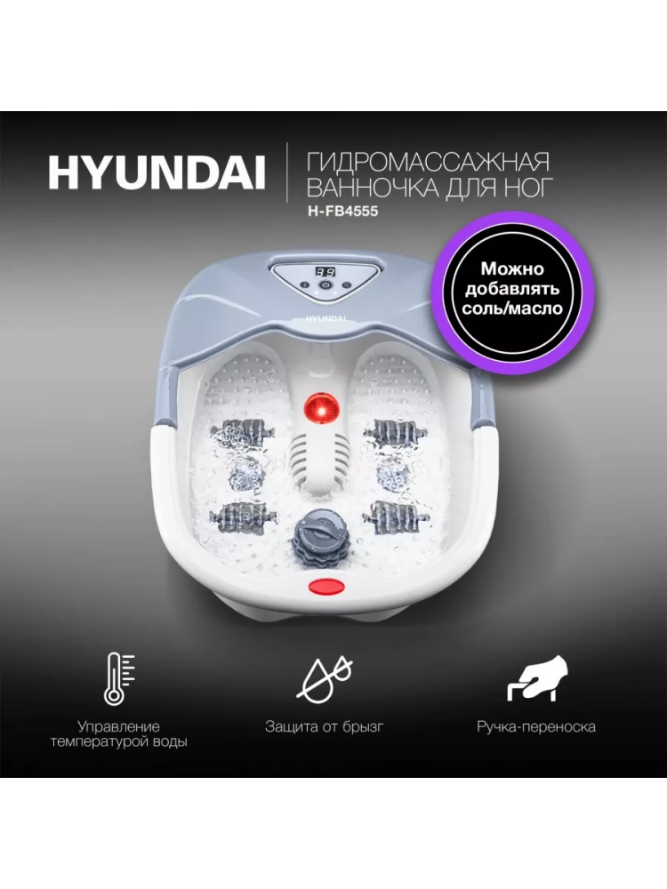 Гидромассажная ванночка HYUNDAI H-FB4555 белый/серый, мощность 420Вт. Максимальный объём заполнения = 9 литров, инфракрасный прогрев, функция массаж, функция поддержания температуры, функция подогрев, аэромассаж(пузырьковый), рефлекторный, точечный/аккупунутурный, защита от брызг.