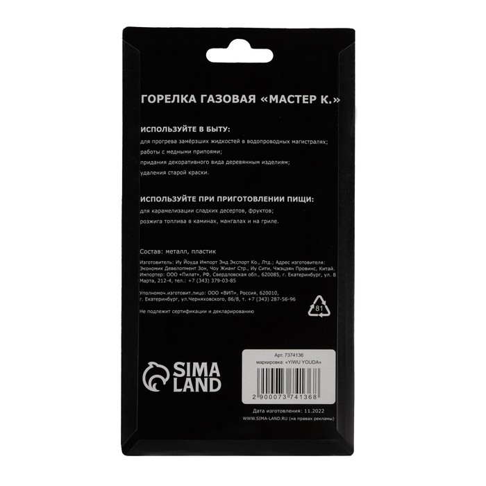 Горелка газовая на баллон "Мастер К" 920, с пьезоподжигом, 18 х 6 см