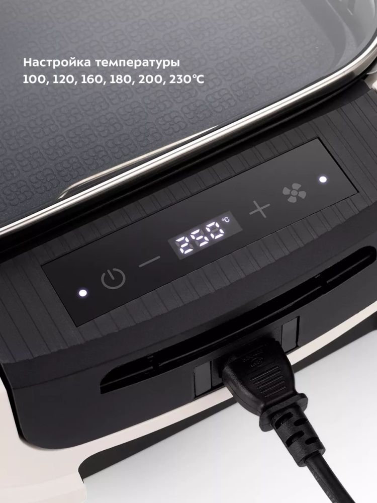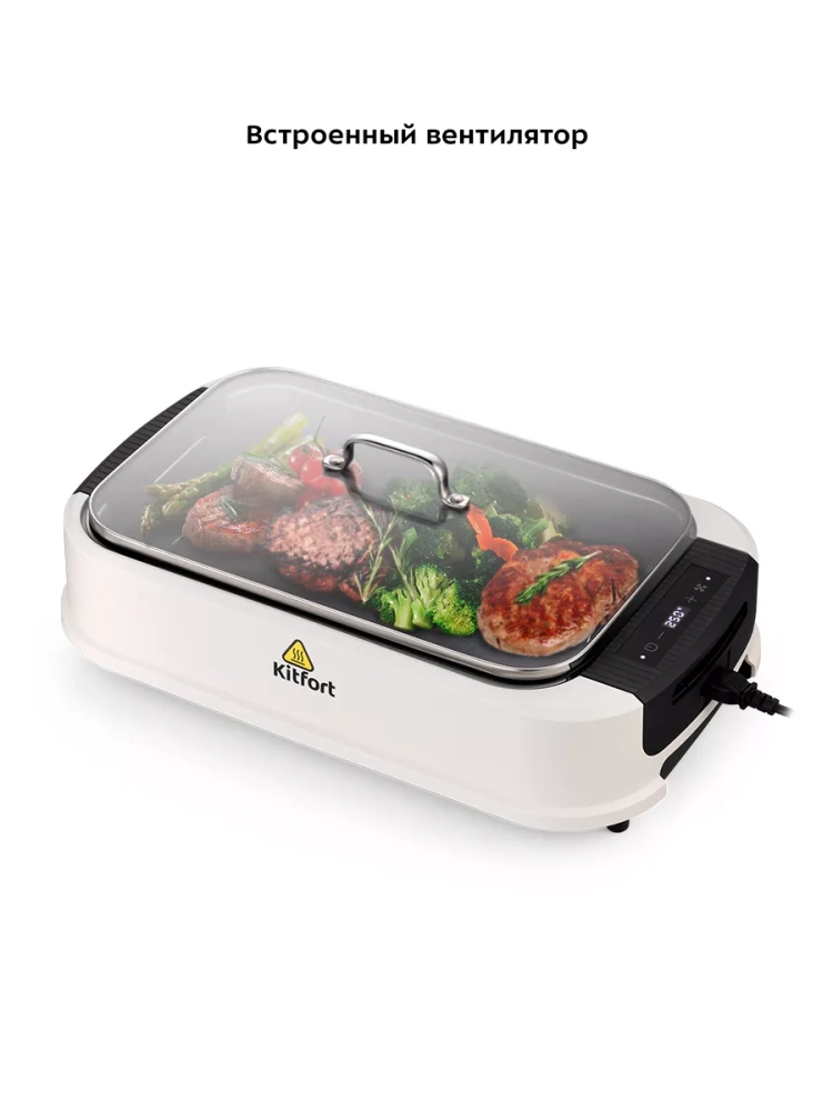Вентилятор позволяет удалять из гриля образующийся в процессе готовки дым, что улучшает качество приготовления и препятствует запотеванию крышки — вы сможете без проблем наблюдать за степенью готовности продуктов.
