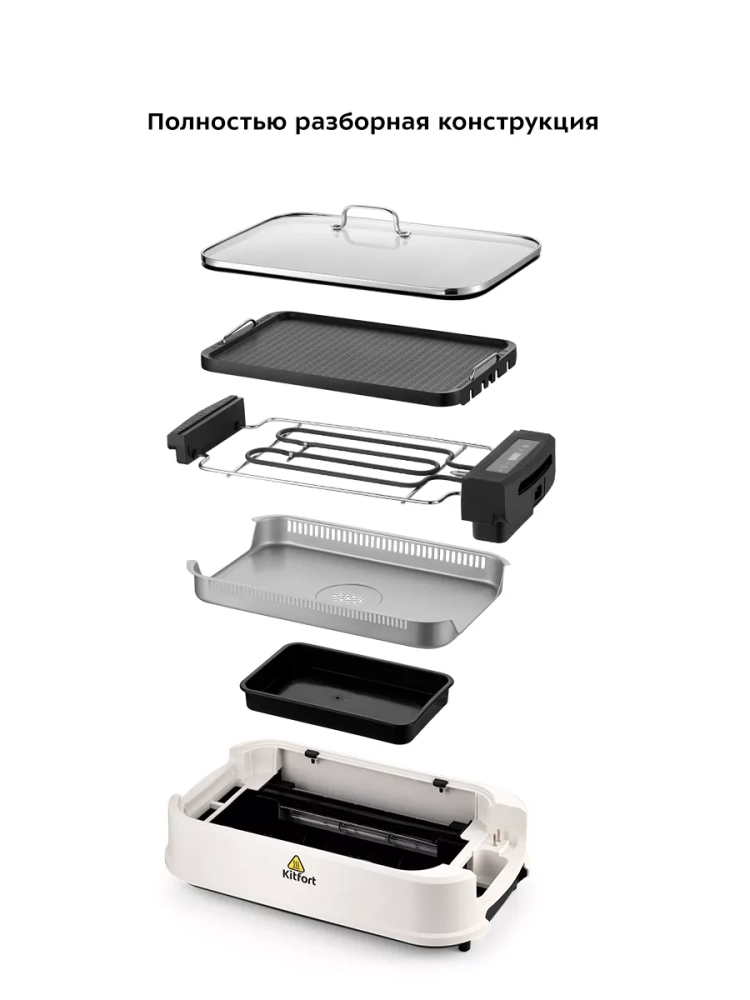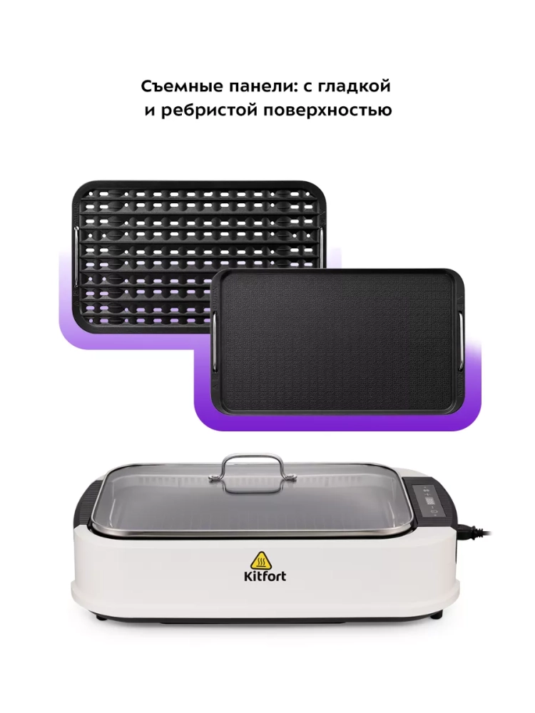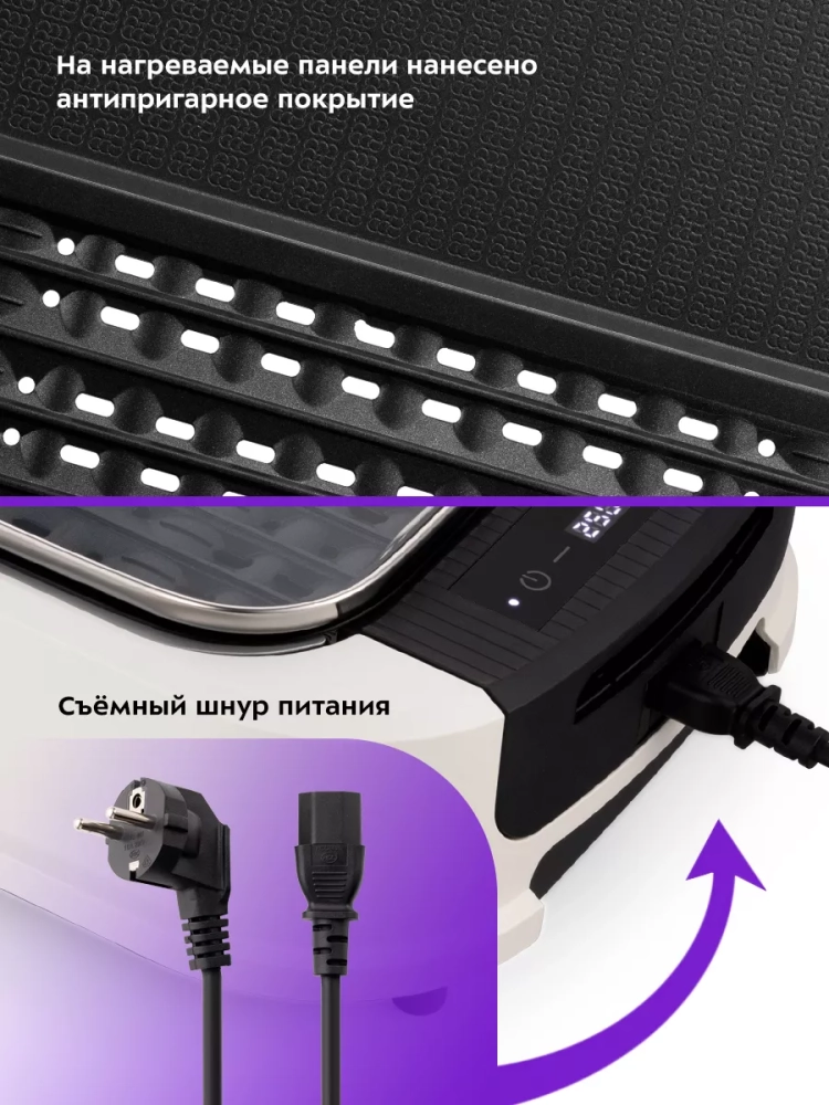 У прибора две панели для жарки: с гладкой и ребристой поверхностью. Панель с ребристой поверхностью позволяет получить характерный «полосатый» рисунок на поверхности продуктов. Для удобства ухода панели сделаны съемными — их можно мыть под проточной водой.
