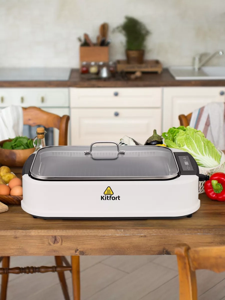 Электрогриль Kitfort КТ-1685 предназначен для приготовления мяса, рыбы, овощей, сосисок, бутербродов, панини, сэндвичей, гренок, тостов и многих других блюд. Высокая температура способствует быстрому приготовлению продуктов.