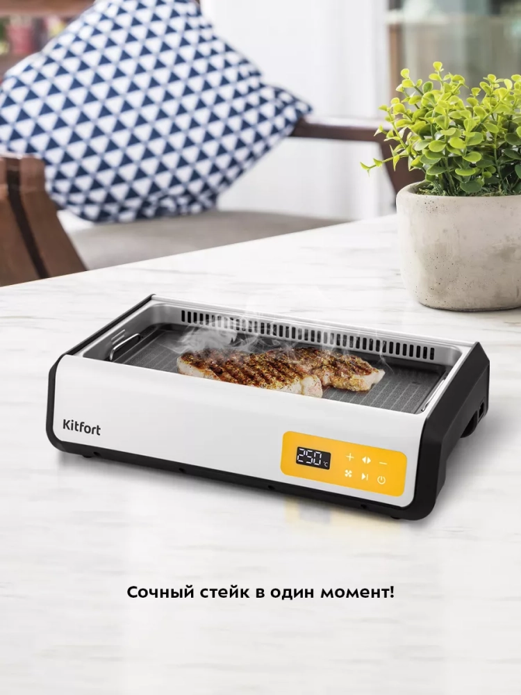 Вентилятор позволяет удалять из гриля образующийся в процессе готовки дым, что улучшает качество приготовления и препятствует запотеванию крышки — вы сможете без проблем наблюдать за степенью готовности продуктов.