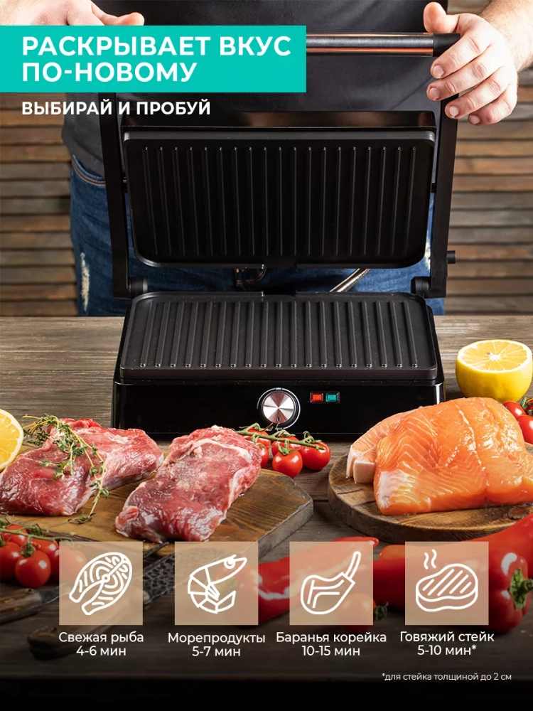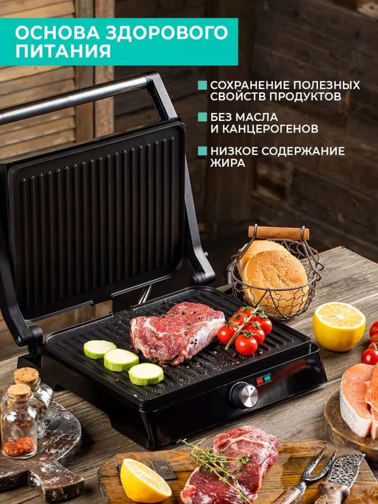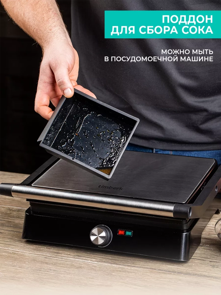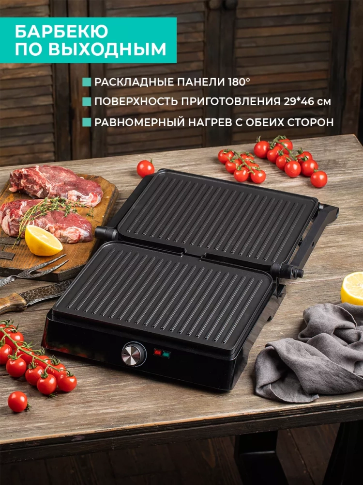 Почувствуй многообразие вкусов с грилем Timberk! Благодаря антипригарному покрытию панелей, готовить блюда можно без масла, поэтому пища получается легкой и низкокалорийной. Мощность 2200 Вт и регулятор температуры обеспечивают качественную прожарку мяса. Открытие панелей на 105 и 180° позволяют увеличить площадь приготовления блюд и уменьшить длительность процесса приготовления. Размер панелей 29х23 см, поэтому Вы сможете приготовить ужин для всей семьи за одно использование, например, поджарить котлеты, креветки, филе рыбы.