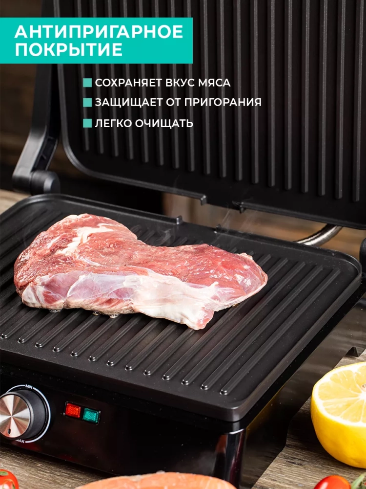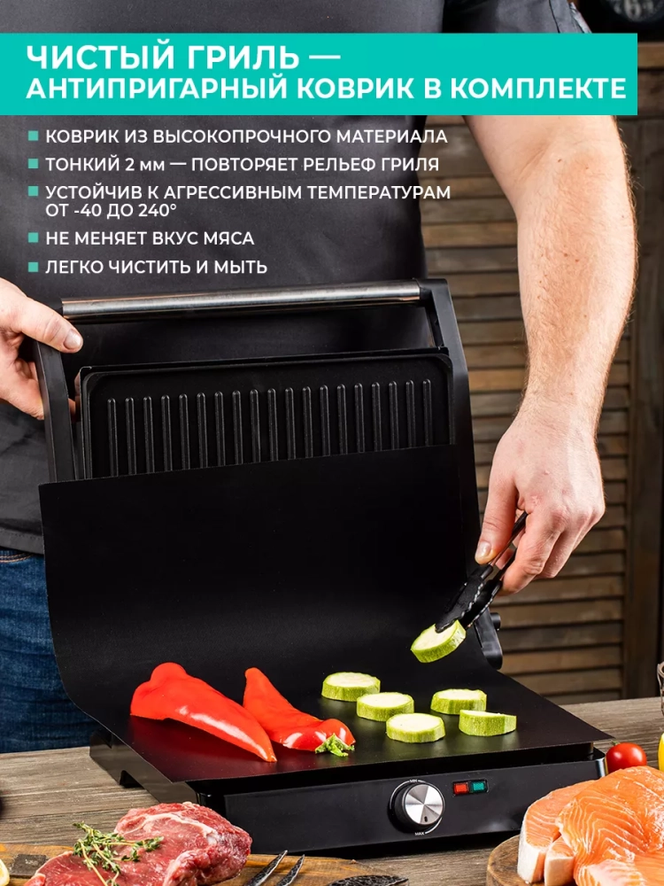 В комплект прибора входят многофункциональный антипригарный коврик размером 40х33 см и съемный поддон для сбора мясного сока, которые максимально упрощают процесс очистки прибора.