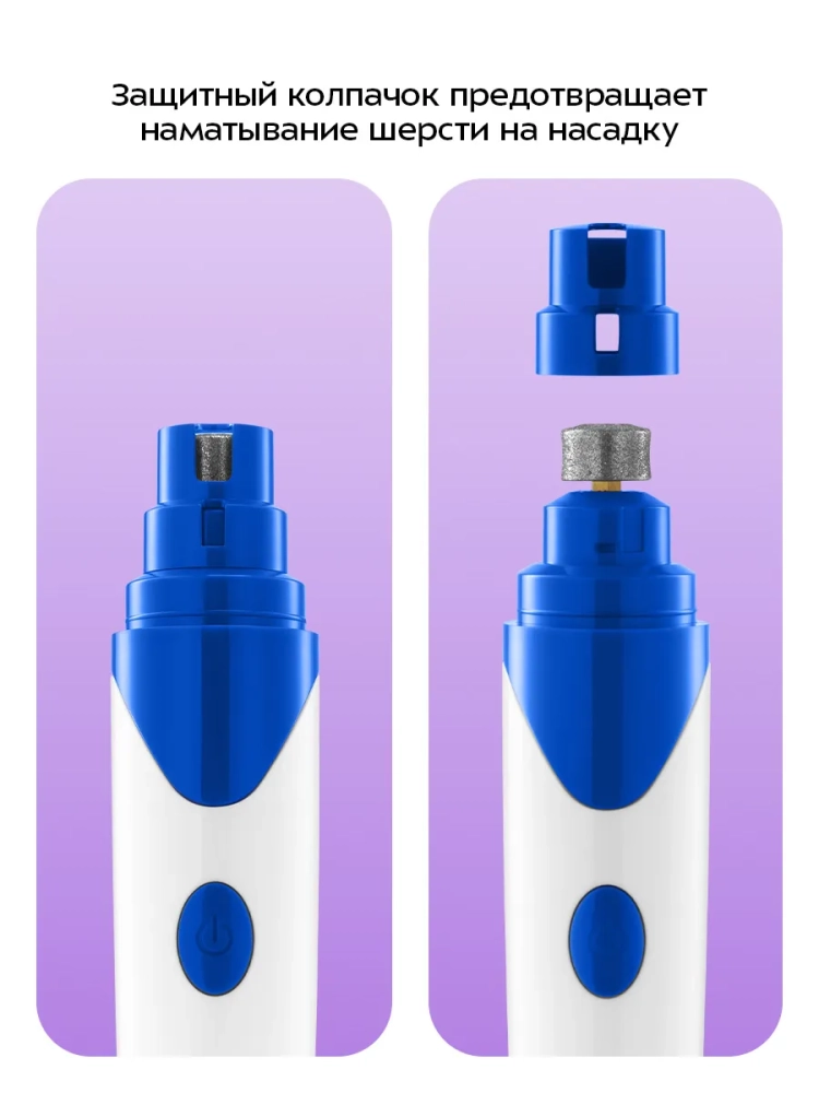Защитный колпачок предназначен для защиты от наматывания шерсти на насадку, а также от пыли, возникающей при стачивании когтя. В защитном колпачке сделаны две прорези для когтя: на выбор более удобной прорези влияет размер лапы и когтя, а также удобство работы. Расстояние от защитного колпачка до вращающейся насадки рассчитано так, что вы не сможете слишком сильно сточить коготь, когда защитный колпачок установлен.