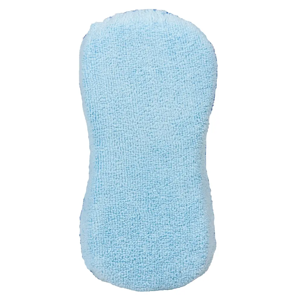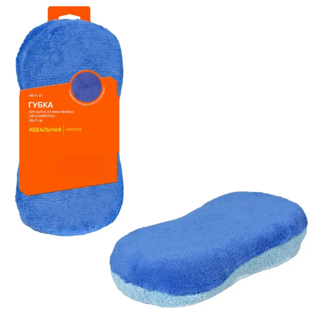 Губка в форме цифры восемь изготовлена из микрофибры и предназначена для влажной уборки поверхностей в салоне автомобиля или дома. Нижняя часть губки окрашена в ярко-синий цвет, а верхняя имеет нежно-голубой оттенок. Губка активно впитывает жидкость, а также не оставляет разводов на протираемой поверхности.