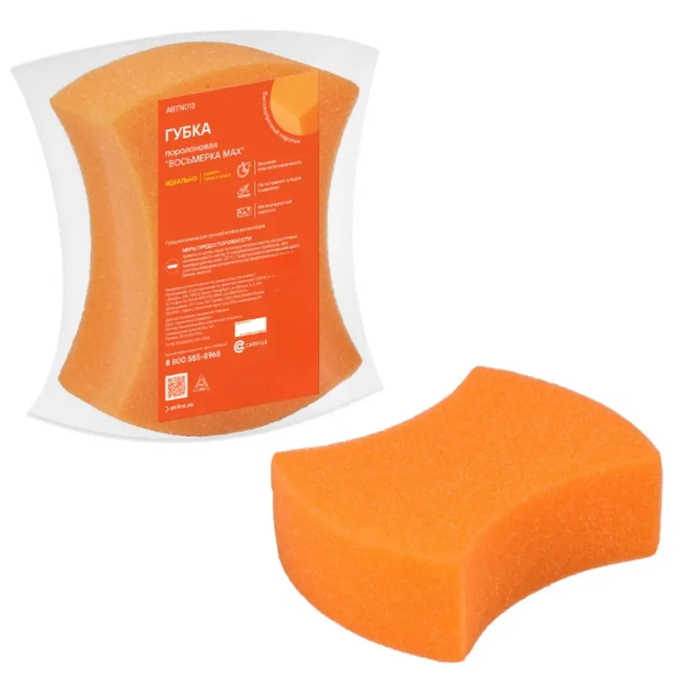 Губка поролоновая "Восьмерка MAX" оранжевого цвета в форме "восьмерки" отличается увеличенным размером для ПРОФЕССИОНАЛЬНОГО применения. Губка изготовлена из ВЫСОКОПРОЧНОГО мелкопористого поролона - это доступное и качественное средство для избавления от загрязнений на поверхности стекол, фар и корпуса автомобиля. Губка обладает особой поверхностью, которая легко и плавно очищает автомобиль, не создавая после уборки царапин или разводов. Имеет высокую влаговпитываемость и легко отжимается, хорошо пенится.